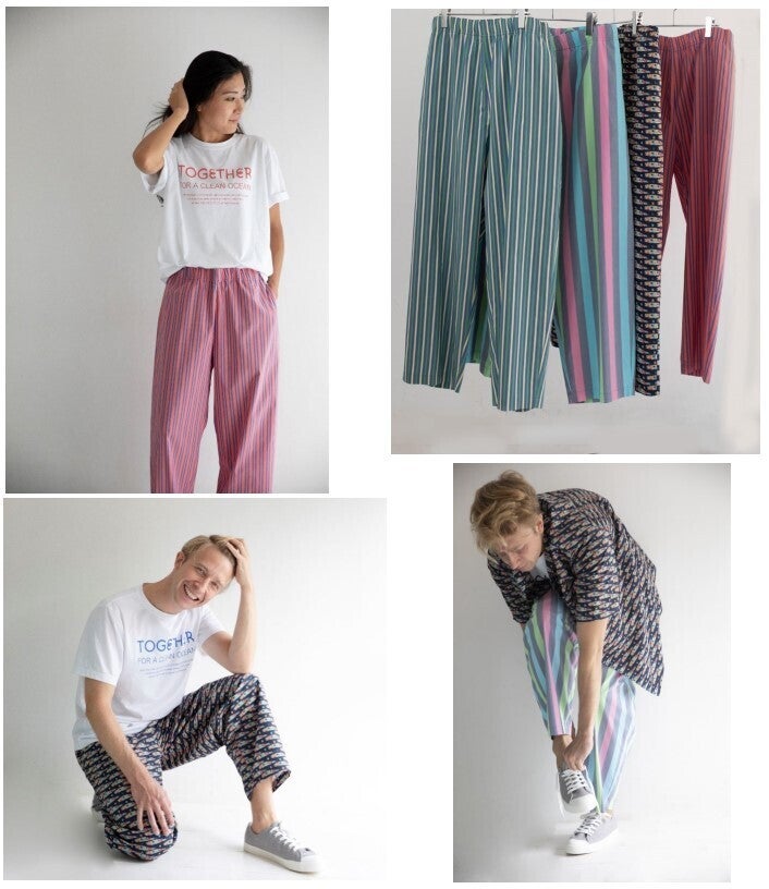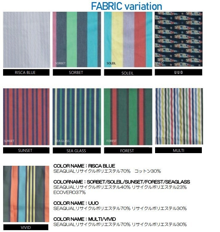 海洋「ごみ」を回収、選別した【UPCYCLING MARINE PLASTIC" SEAQUAL® FABRIC"】でカラフルなラインが魅力的なストライプ生地、そしてポルトガルと日本が融合した見た目も楽しい魚柄生地でバッグや様々なリゾートウエアを作りました。