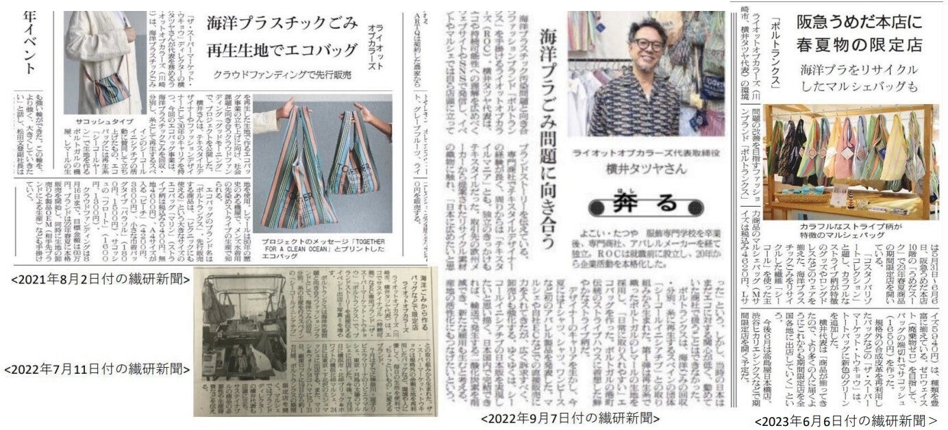 「これが!!海のごみ?」 ・・・40代女性「インスタフォローしてました、素敵ですね」・・・50代女性「大学生の息子が学校で海洋汚染問題の勉強してます、教えますね・・・写真撮っていいですか?」50代ご夫婦・・・「この巾着、ちょっとのお出かけにすごく便利です!いつも使ってます」40代女性・・・「エコもこれくらいおしゃれならいいわね」60代女性・・・「学校でカーボンニュートラルについて勉強してます、詳しくお聞きしていいですか?」大学生 ・・・「SDGsのターゲット14「海の豊かさを守ろう」に興味を持っており、2022年度 学生海洋ビジネスアイデアコンテストに応募することを目指して情報収集を進めています。そんな中、御社の海洋プラスチックごみの生地からエコバックをつくることについて関心を持ちました。詳細をお伺いしたいです」高校生等々・・・・