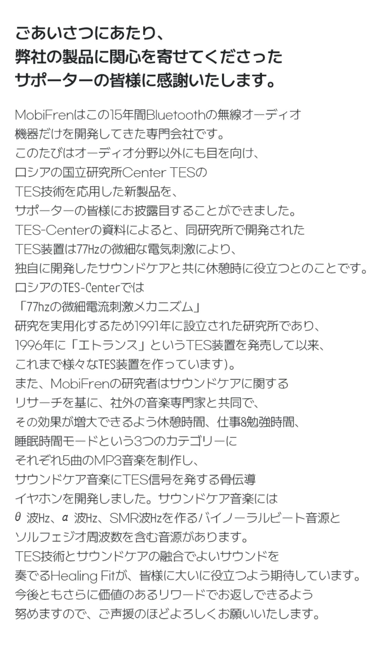 わたしたちは、「MOBIFREN Healing Fit」を日本に輸入する為に、現在工場とデザイン・仕様を実現できるよう、プロジェクトを誠心誠意進めています。 しかしながら、開発中の工程において、デザイン・仕様が一部変更になる可能性もあります。 デザイン・仕様の変更はより良い商品を皆様のお手元に届けたいからであることご理解頂けると幸いです。使用感などに関しては、感じ方に個人差が予想される製品でございます。そのため、使用感等に関する返品・返金はお受けいたしかねます。 並行輸入品が発生する可能性があります。個人輸入及び販路によっては防ぐことができない可能性がある点、ご了承願います。(※並行輸入品は正規代理店による製品保証を受けることができません。また、正規代理店を通じて購入することで、日本国内での流通に必要な各種認証の取得や、関税の適切な処理が担保されます。) 製造スケジュールについては、現在プロジェクト成功を想定した数で調整しておりますが、 想定を上回った場合、製造工程上の都合や配送作業に伴う止むを得ない事情により、 お届けが遅れる場合がございます。 上記のようにプロジェクトページに記載している内容に変更がある場合は、できるだけ早く活動レポートなどで共有を行っていく予定です。 最後に、「MOBIFREN Healing Fit」を手に取った皆様に喜んで頂けるよう、チームメンバー一同心を込めて対応していきますので、宜しくお願い致します。