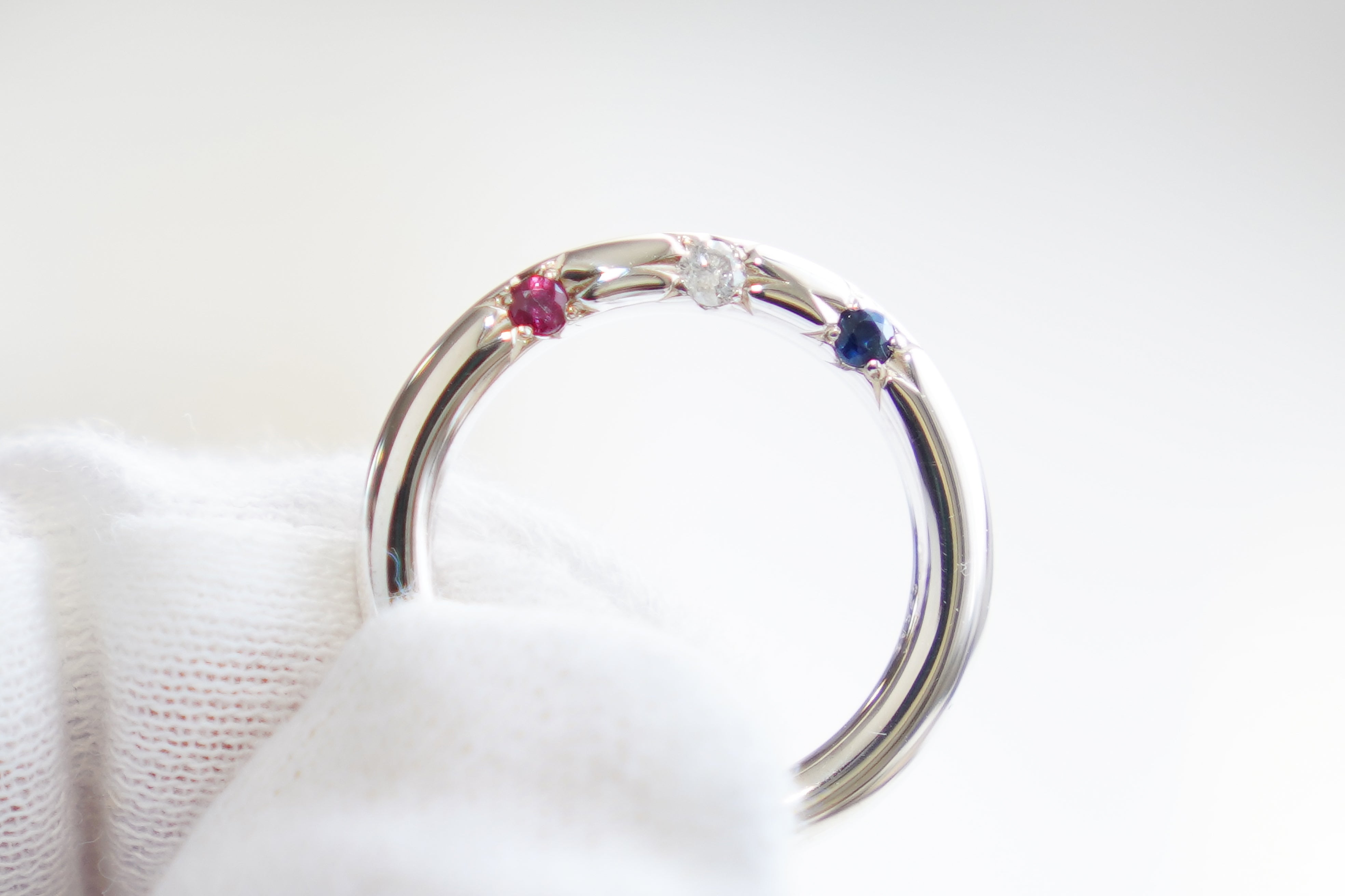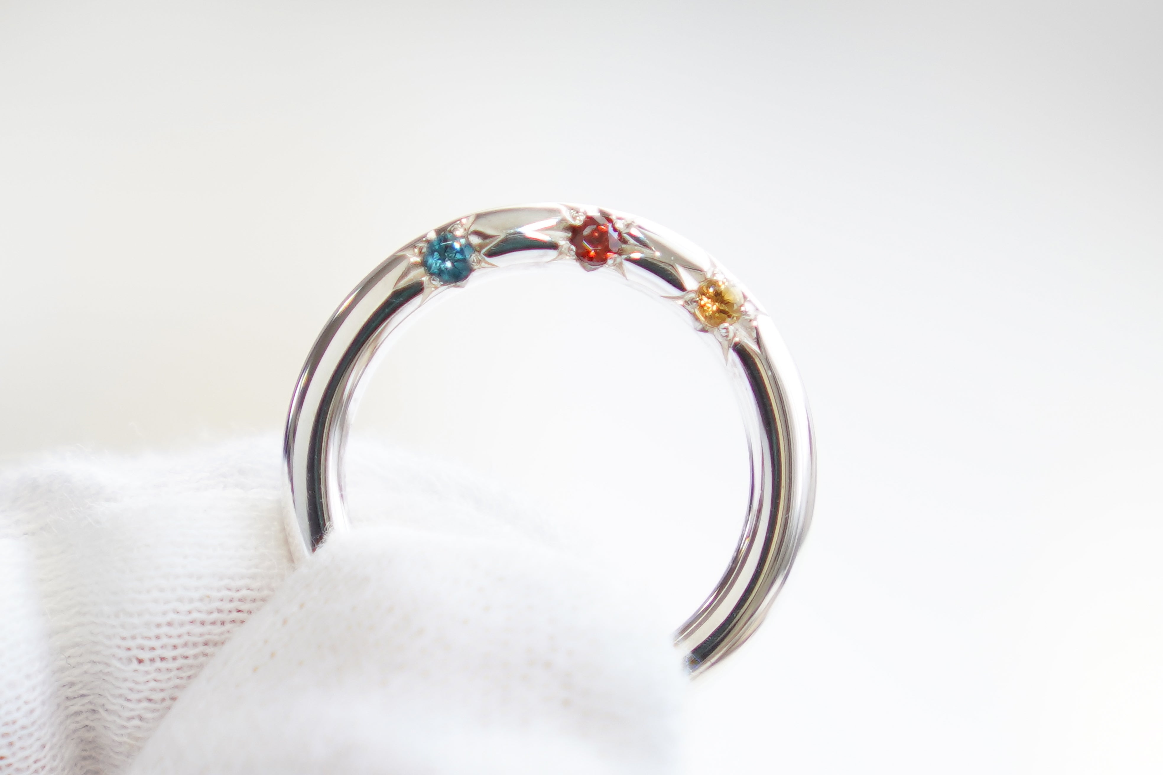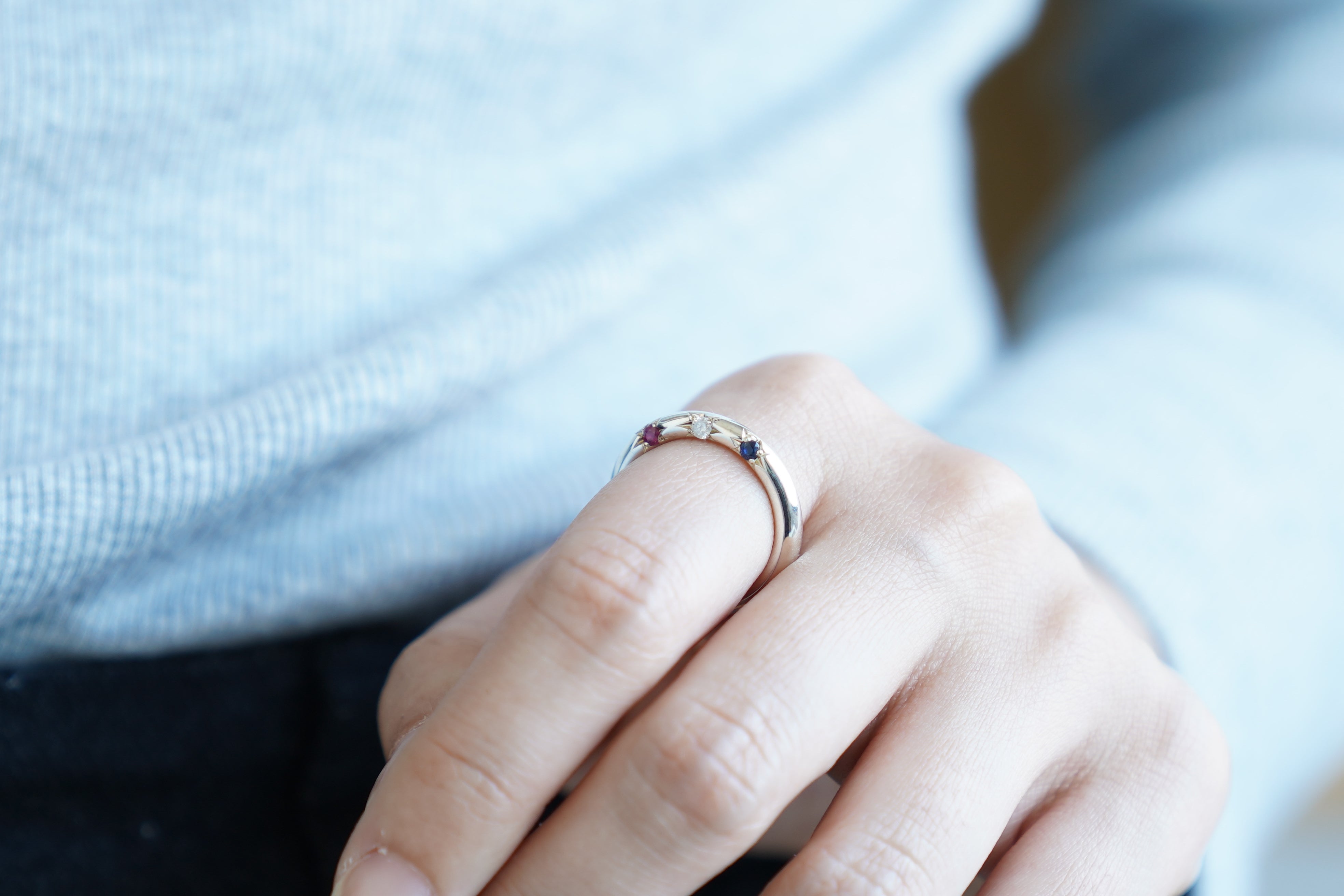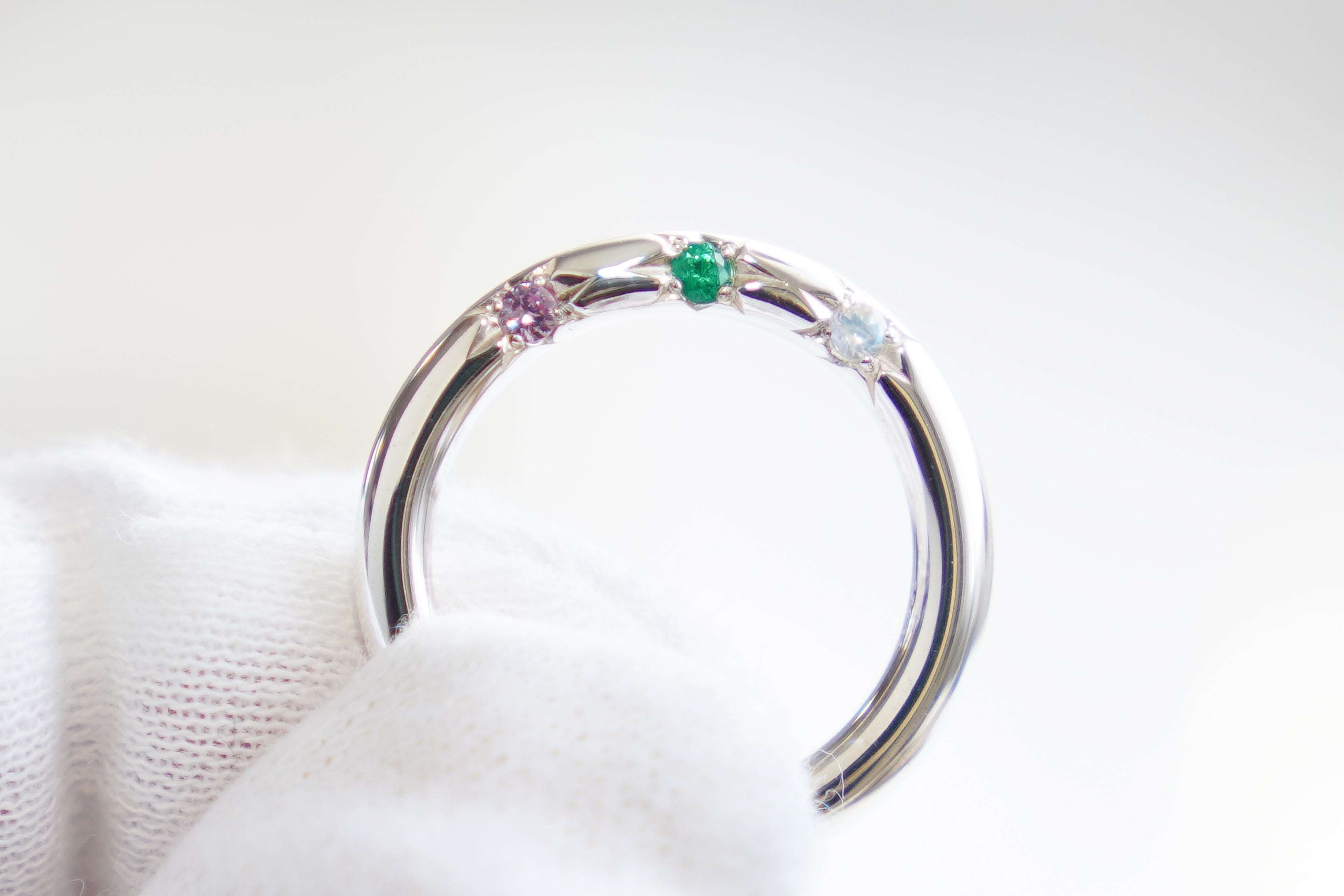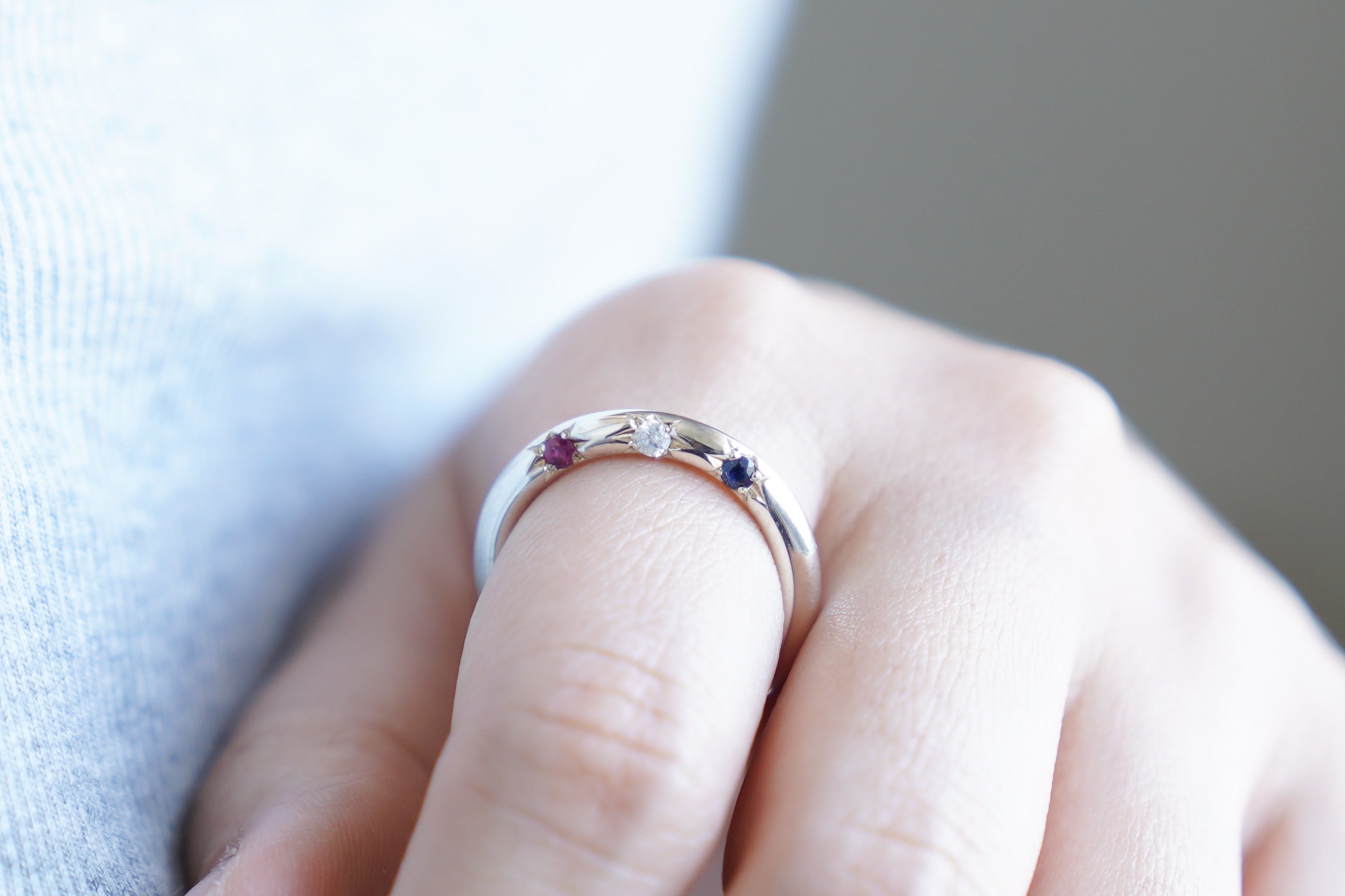 リングには1石、2石、3石とお好きなデザインを選んでいただき、お好きな誕生石を埋め込むことができます。ご自身の誕生月だけでなく、恋人やパートナーと合わせた2石を選んでいただいたり、お子さんを含めた3石を埋め込んだファミリーリングなどデザインはあなた次第。誕生石の組み合わせをカスタムできるからこそ、あなただけの特別なリングをお楽しみください。