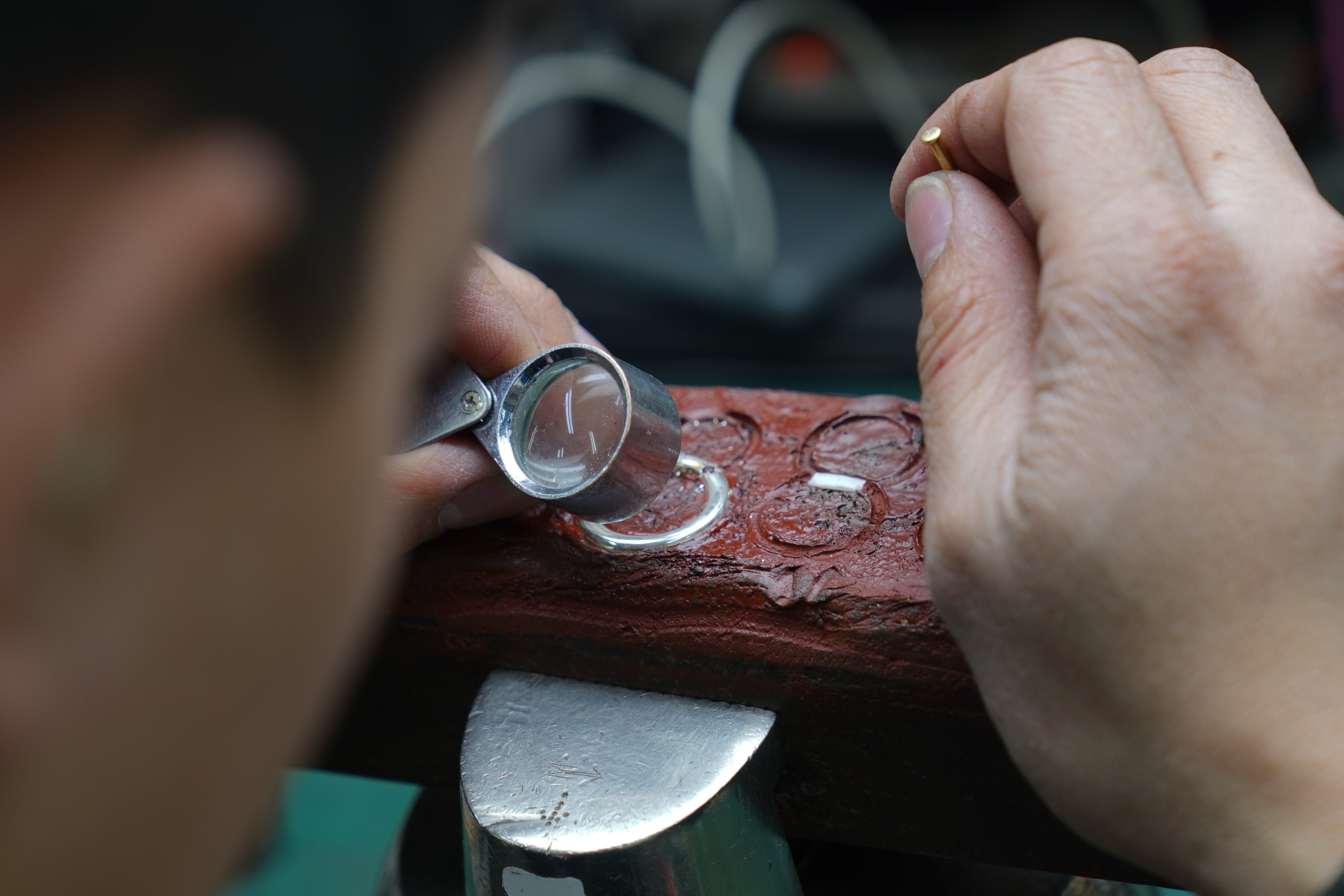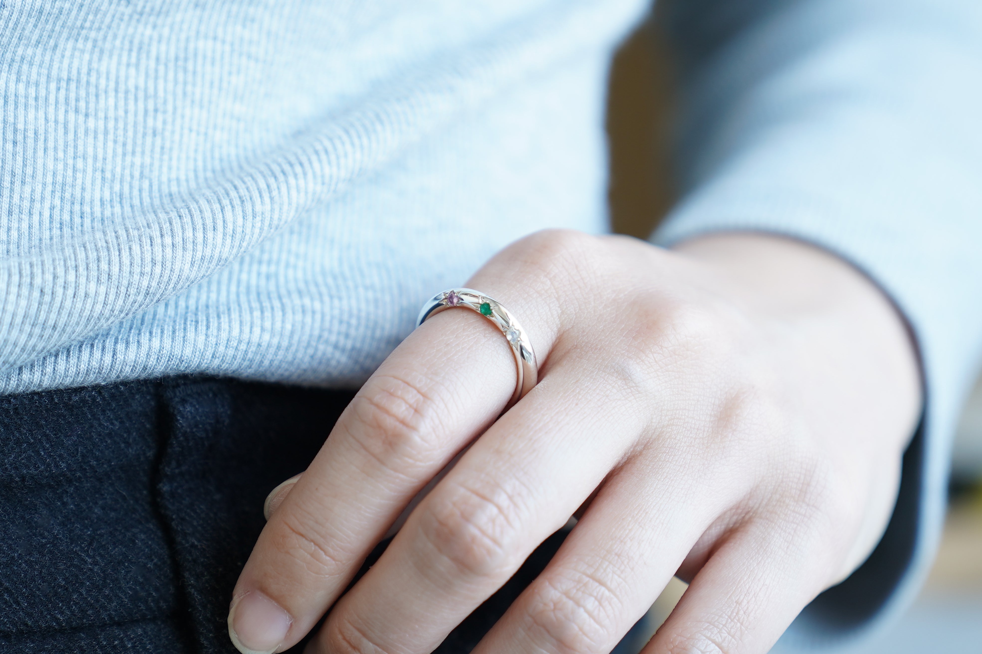 今回のカスタムリングは、ひとつひとつ丁寧に、誕生石を埋め込みます。職人が手作業で作るジュエリーは、機械化されたジュエリーとは異なり、クラフト感があり、人の温もりが籠っています