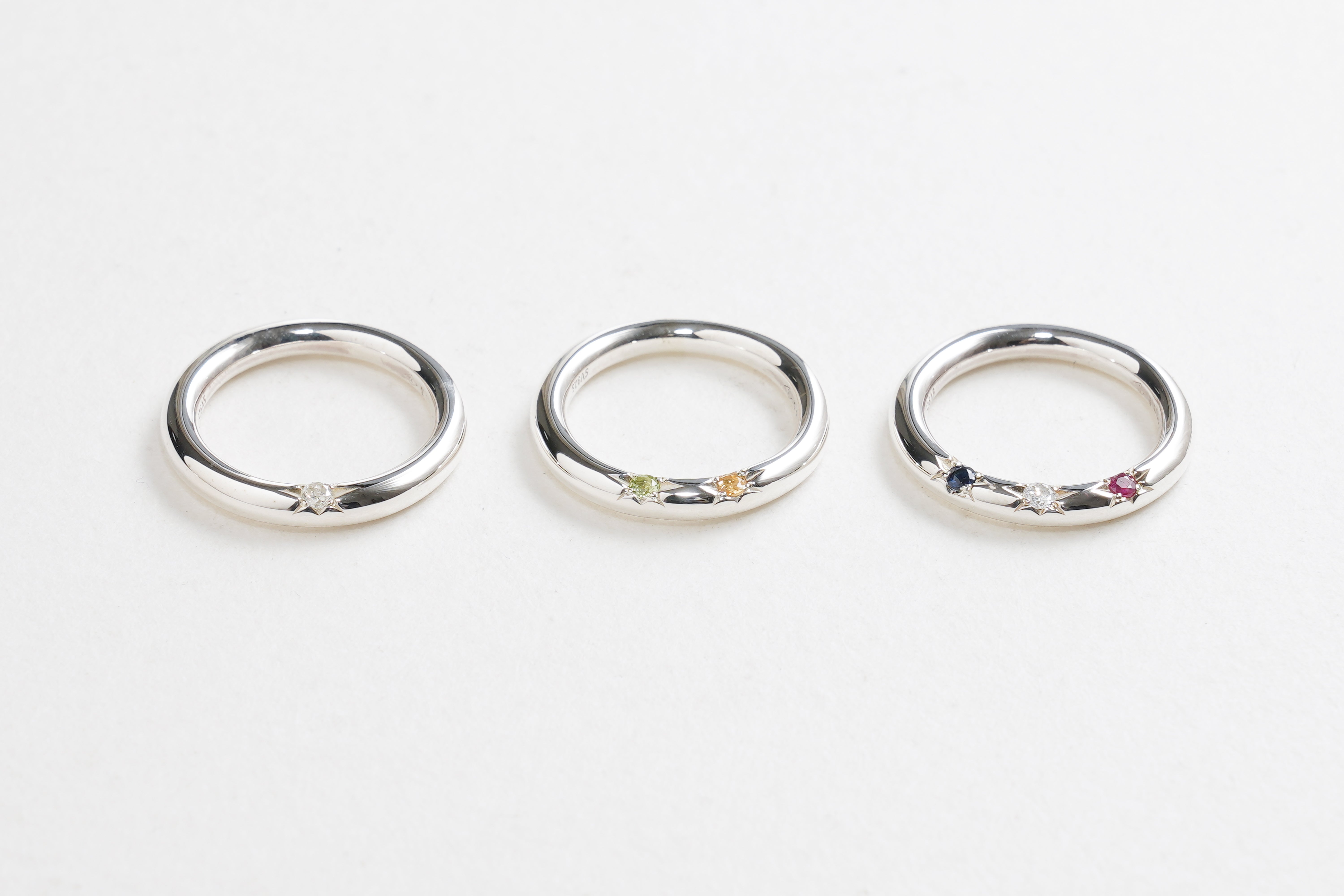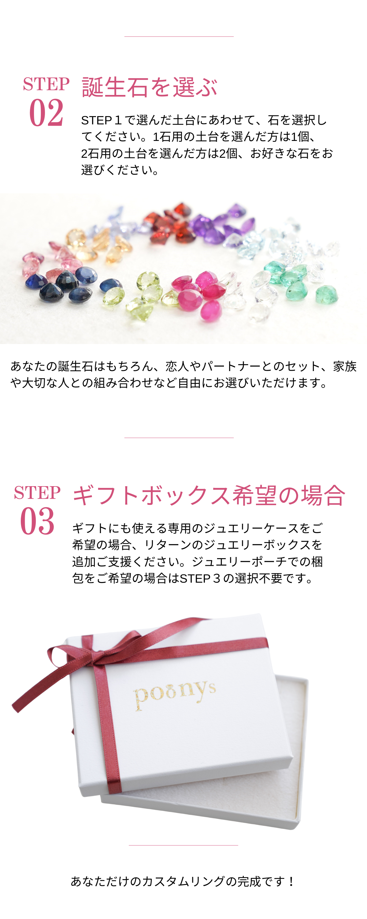 リング本体(1石・2石・3石の3パターン)を選び、本体に合わせた数の誕生石をリターンでそれぞれ選んで頂き、すべてを合わせて1つのリングに仕上げてお客様にお届けいたします!