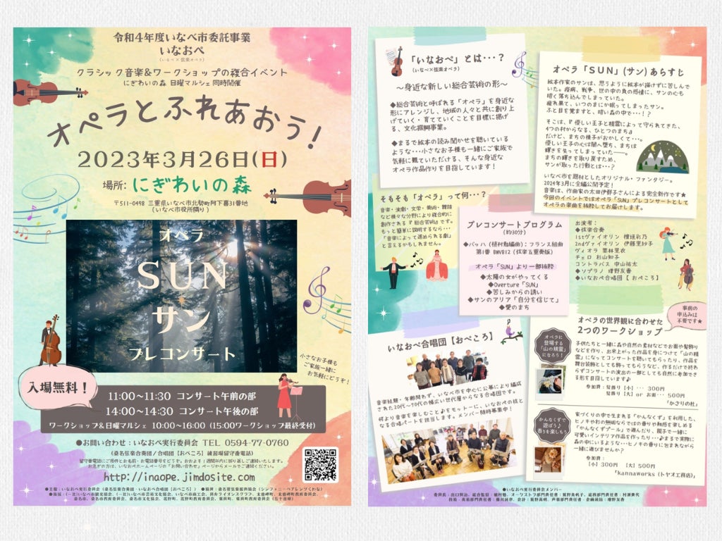 この「いなおぺ(いなべ×弦楽オペラ)」は、「総合芸術」であるオペラを身近な形にアレンジし、地域のみんなが参加して、誰もが楽しめる新しい「音楽文化」として三重県いなべ市から発信し、発展していくことを目指しています。