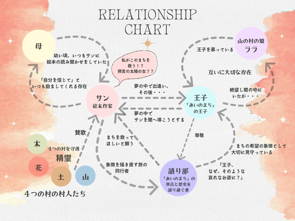 物語は、優しいがゆえに傷つき絵を描けなくなってしまった主人公の絵本作家「サン」が、疲れて眠ってしまい、いつの間にか迷い込んでしまった森で、「愛のまち」の「語り部(預言と歴史を語り継ぐ者)」と出会い、荒れてしまった「愛のまち」を救うため、4つの村を旅するストーリー。