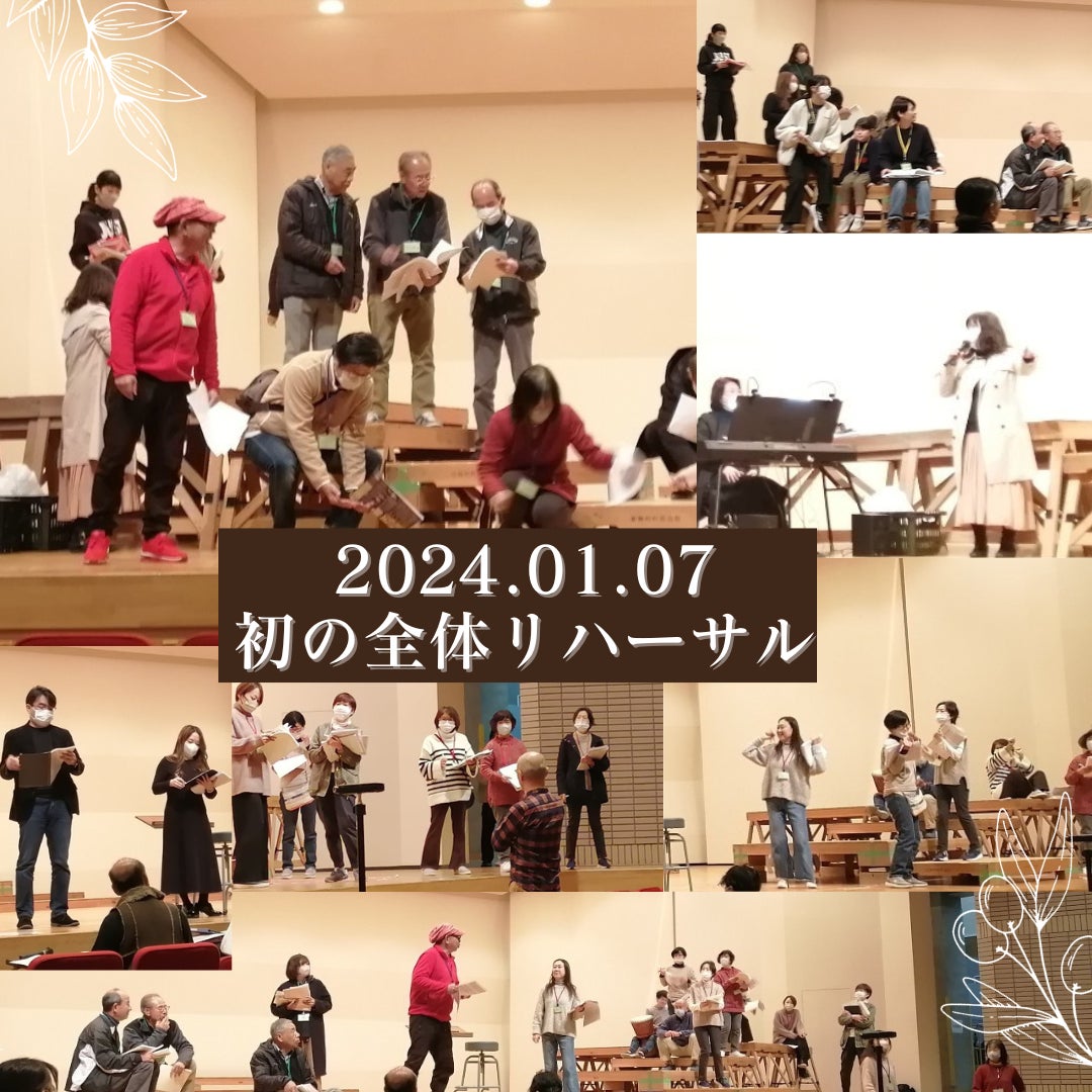 2024/01/12 18:52みなさまこんにちは!去る1月7日(日)、三重県いなべ市にあります北勢市民会館さくらホールにて、初の全体リハーサルがありました!午前中は、ソリストの皆さん、公募で集まった村人役の皆さん、出演協力をいただく劇団すがおの皆さん、他にもたくさんの方にご参加いただき、オペラSUNの作曲家で今回の演出もご担当いただく太田伊都子先生主導のもと、演出の動きについてご説明いただきました。公募で参加された方の中には初めて舞台に上がる方もいらっしゃったかもしれませんが、皆さん積極的に動いていただき、また演技の面では劇団すがおの皆さんにも助けていただき、有意義な練習となりました!午後からは合唱団おぺころとオーケストラを担当する桑名弦楽合奏団も参加して音楽中心の稽古を行いました。いよいよ始まった舞台稽古、だんだんとオペラに出演する実感が湧いてこられたのか、皆さんとてもいきいきとされていたのが印象的でした♪ もっと見る
