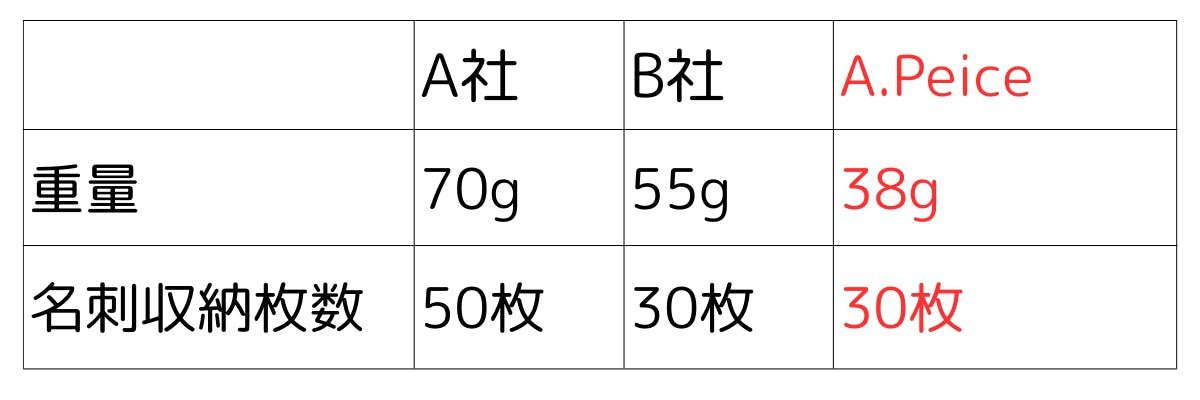一枚革で金具なしだから、驚きの軽さ。一般的なレザー名刺入れと比較してもその差は一目瞭然です。