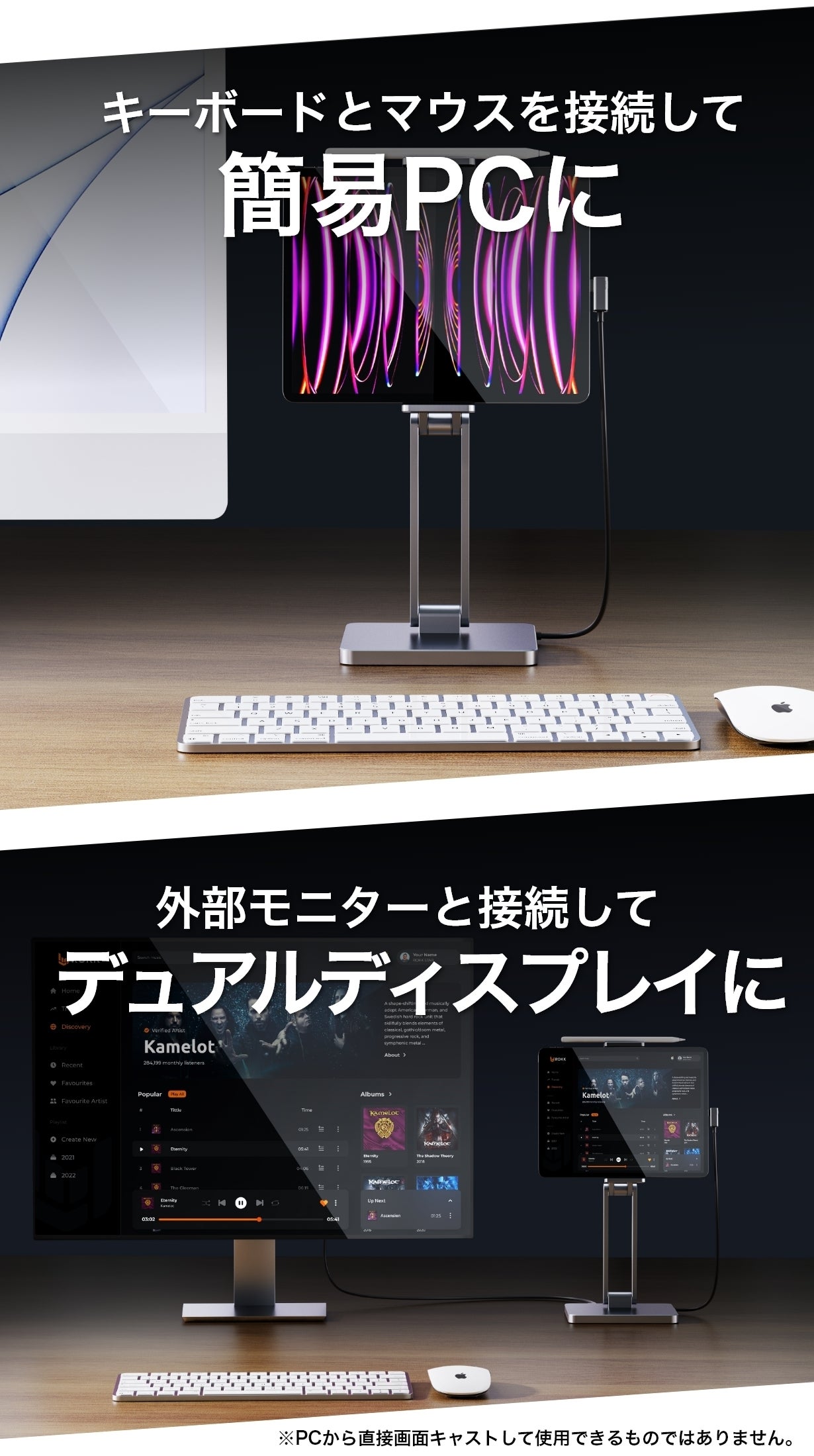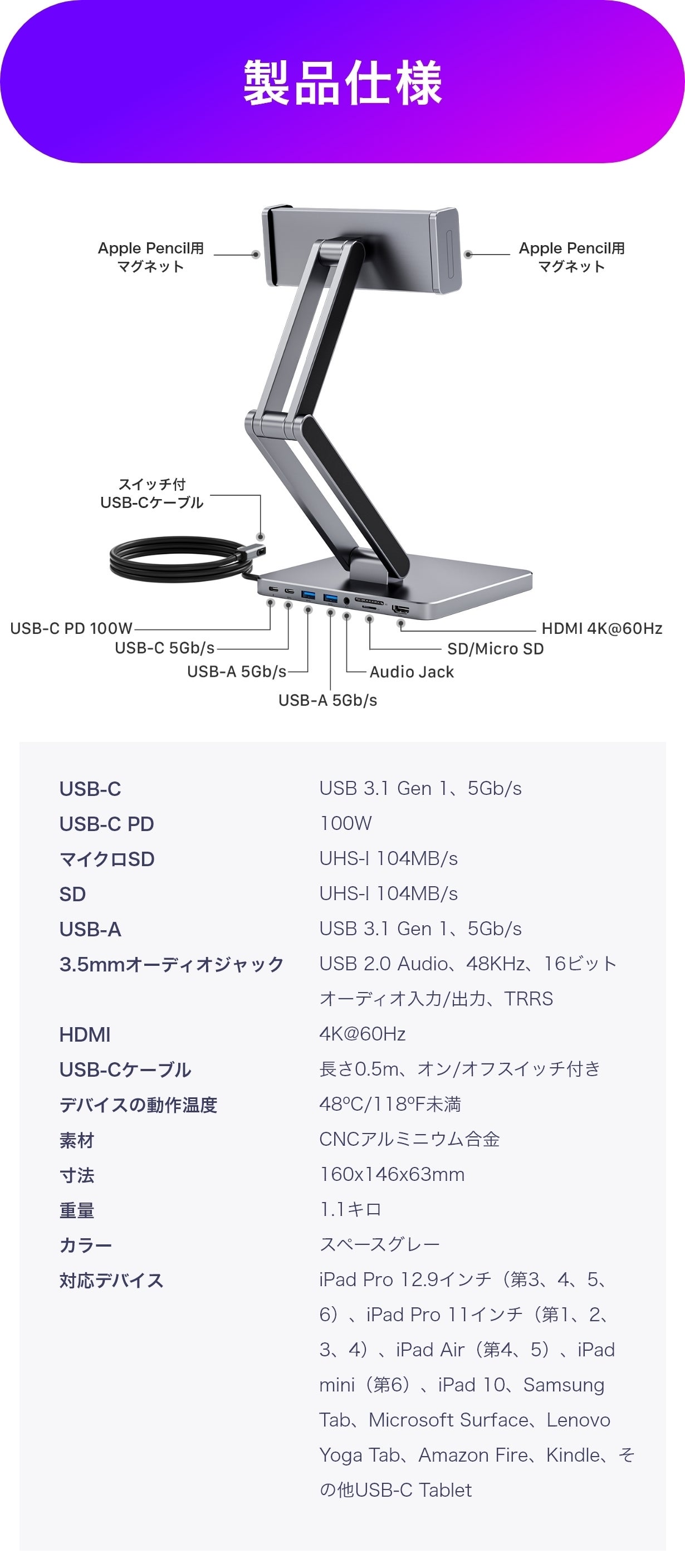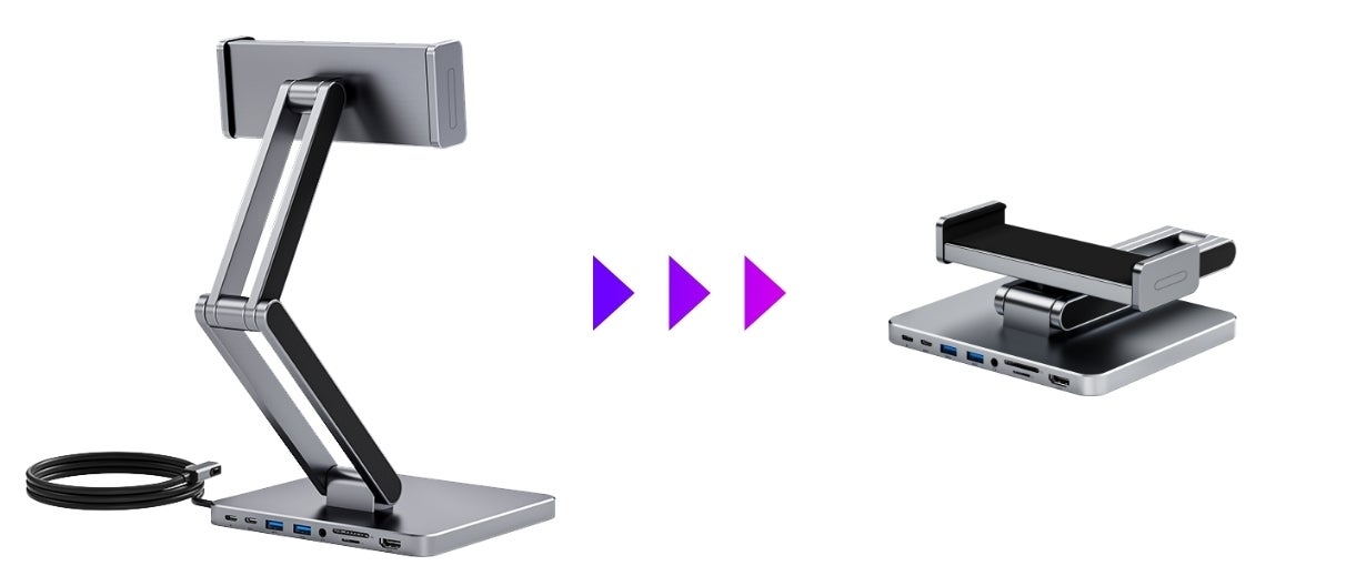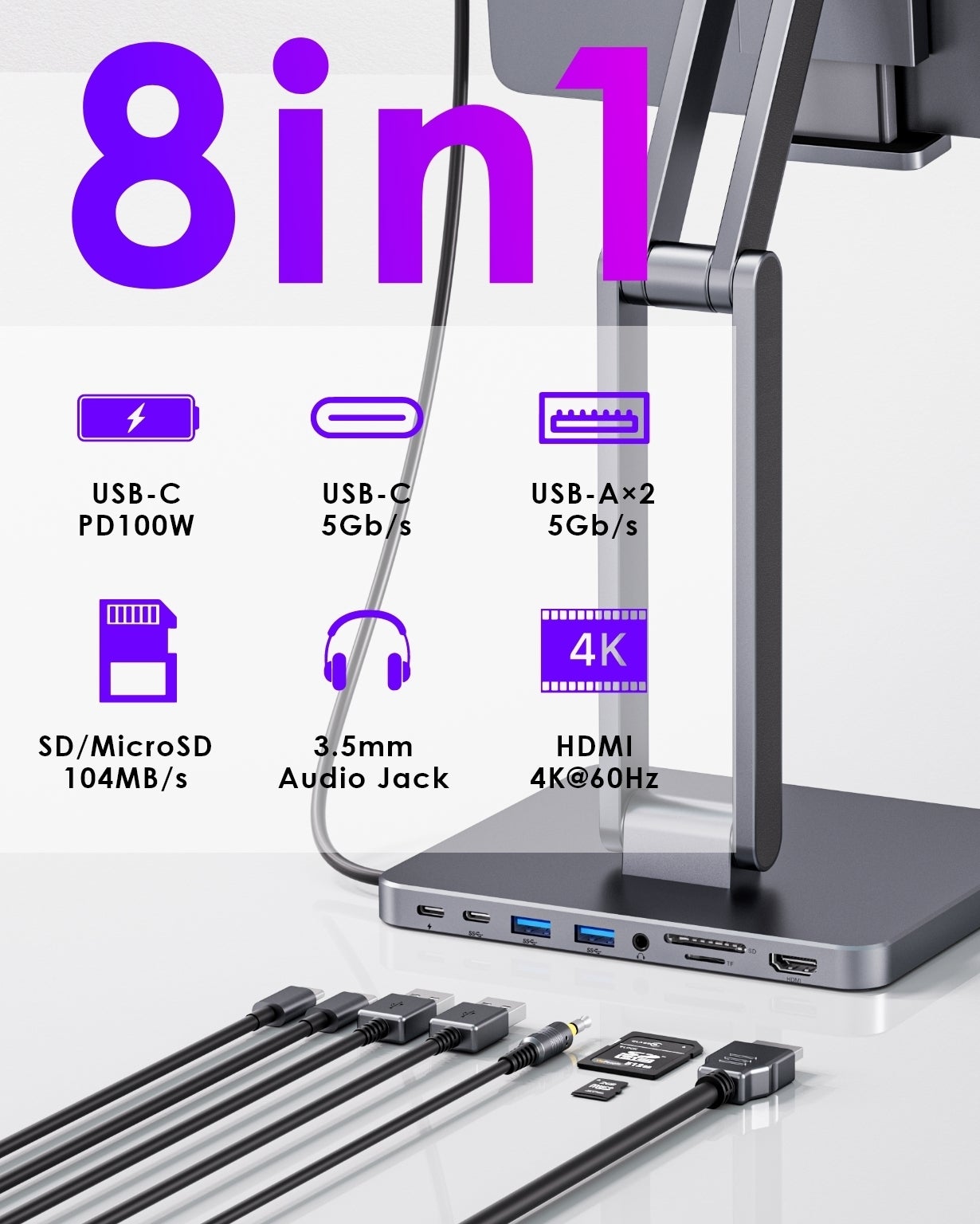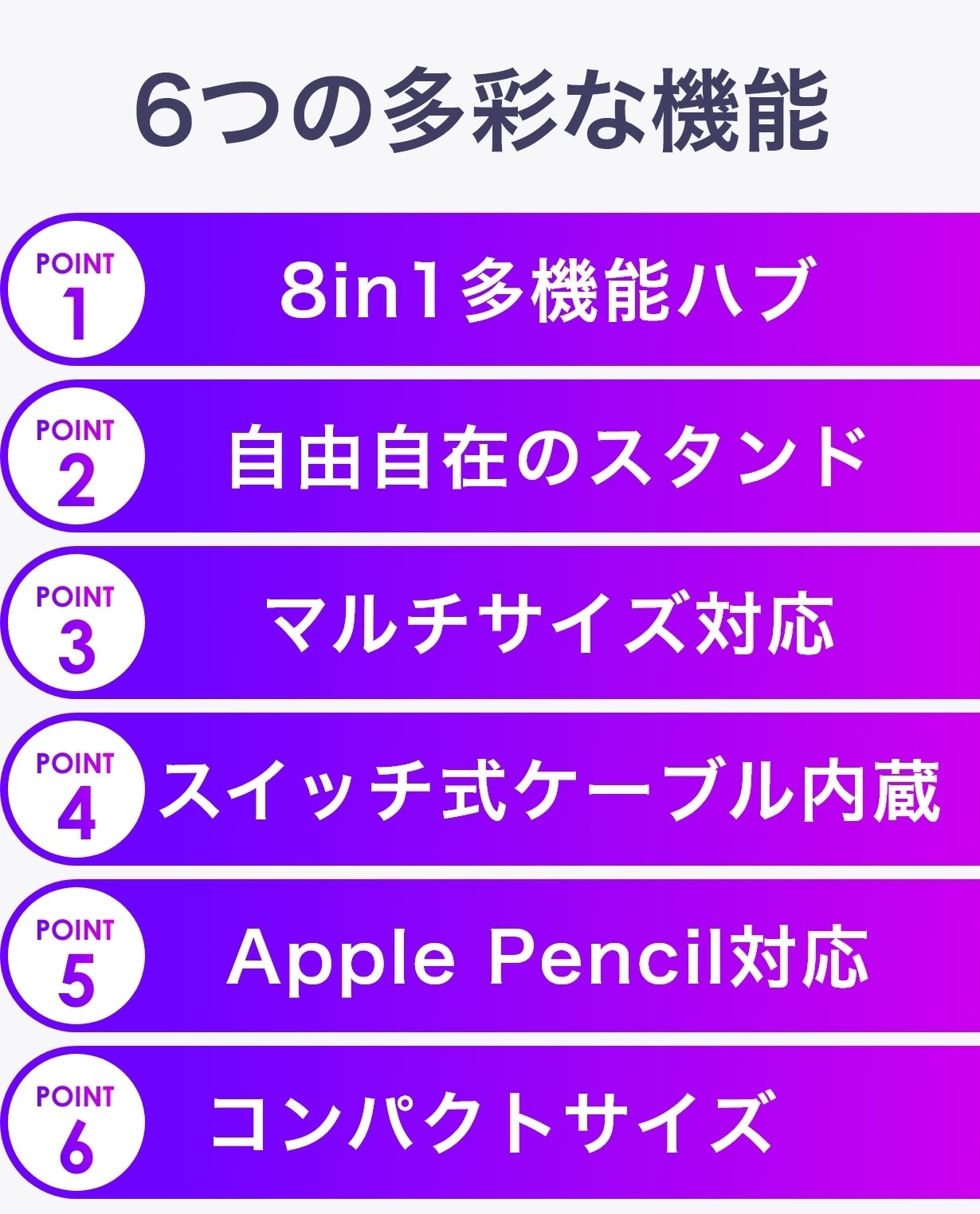 8in1ハブ内蔵で、PD充電から各種ポートまで完備。スタンドを通じて、さまざまなデバイスに手間なく接続。