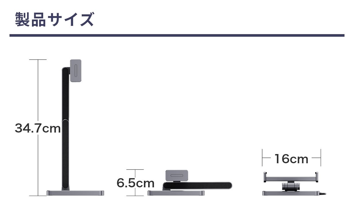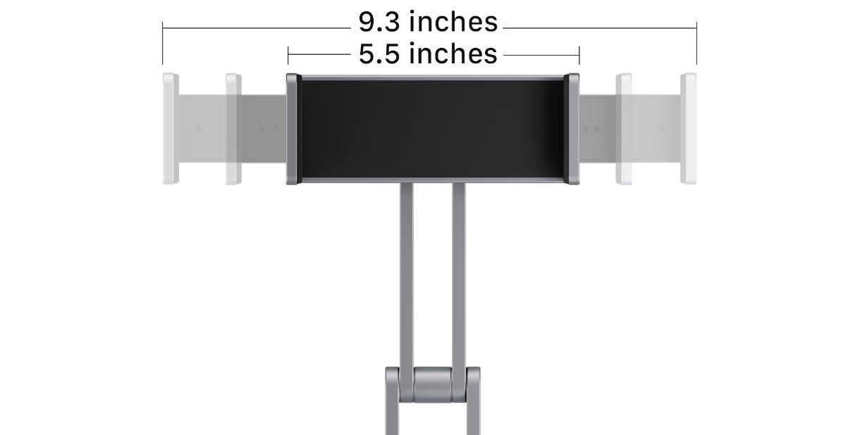伸縮するアジャスターをデバイスホールド部に装着することで、さまざまなサイズのタブレットに対応。また、高品質なアルミニウム製のホルダーが各種タブレットの重さも確実に支え、安定した操作体験を実現します。