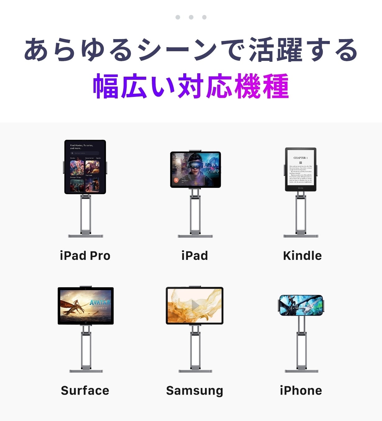 iPad Pro、iPad Air、iPad 10、Surface、Amazon Kindle、Samsung、Lenovo、ASUSなど、主要なタブレットブランドはもちろん、市販の多くのモデルに対応する設計となっています。