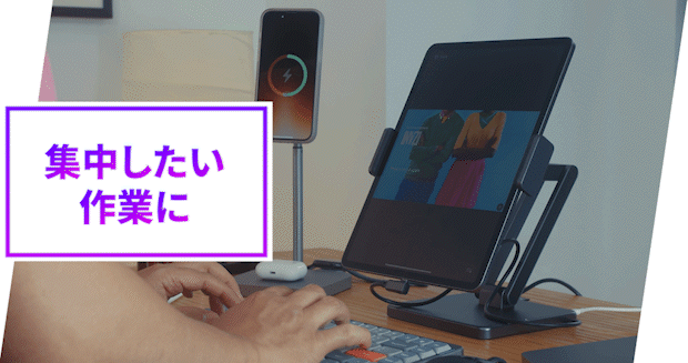 タブレットを低い角度で使うと、姿勢が悪くなり、首や肩にストレスがかかります。特に大きな画面のタブレットは重く、腕にも負担が増えてしまいます。 MagHub 3は理想的な角度を維持できるので、首や腕への負担を軽減し、タブレットの利用をより楽しく、健康的にできるようになります。
