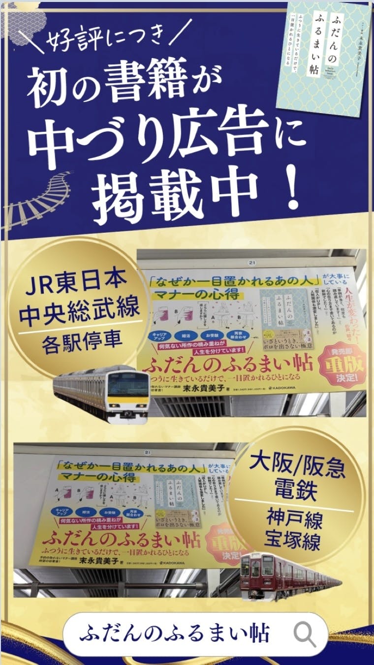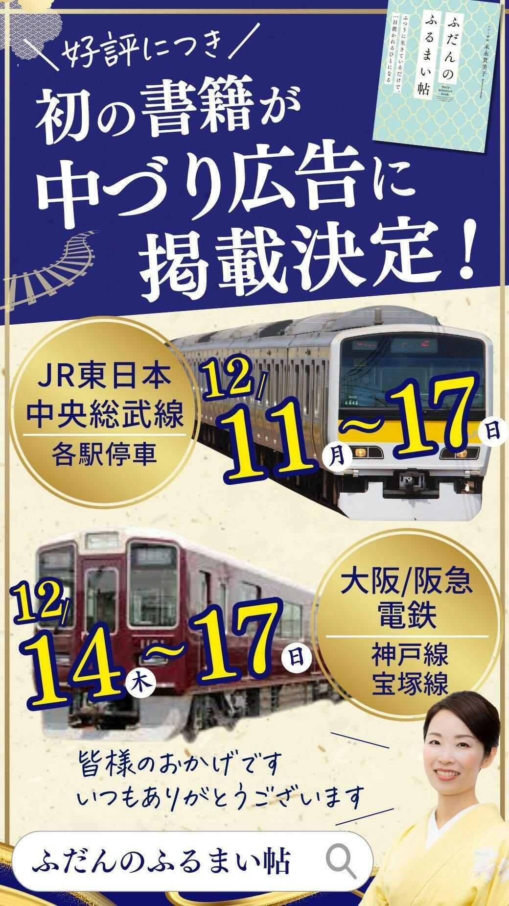 2023/12/10 21:00みなさま、こんばんは! 末永貴美子です。 本日は、皆様に嬉しいお知らせをさせてください。ふだんのふるまい帖の電車広告の掲載が決定いたしました!掲載される電車は、 JR東日本 中央総武線各駅停車 (12/11~12/17)阪急電鉄 神戸線・宝塚線(12/14~12/17) 関東だけでなく、地元関西でも電車広告を掲載いたします。私も電車広告を見に行くのが楽しみです!2023年は、ふだんのふるまい帖と共に走った一年でした。初の書籍「ふだんのふるまい帖」の執筆で始まり、「ふだんのふるまい帖」の電車広告で終える。一年前の自分では想像もできない世界となりました。これも、普段応援してくださる皆様のおかげです。 本当にありがとうございました。ぜひ電車に乗った際にふだんのふるまい帖の電車広告を見つけていただき、インスタグラムでタグ付けしてシェアいただけると嬉しいです。 引き続き応援どうぞよろしくお願い申し上げます。<末永貴美子インスタグラム> https://www.instagram.com/kimiko.suenaga/ もっと見る