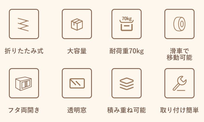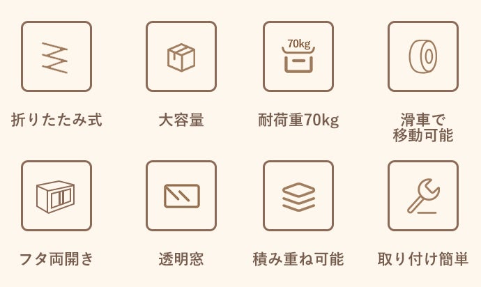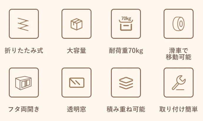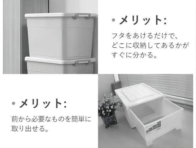 1 個の容量は42L、大容量でさまざまな物を収納できます。季節ごとに衣替えが必要な衣類、キルト、本、小物などが収納できます。