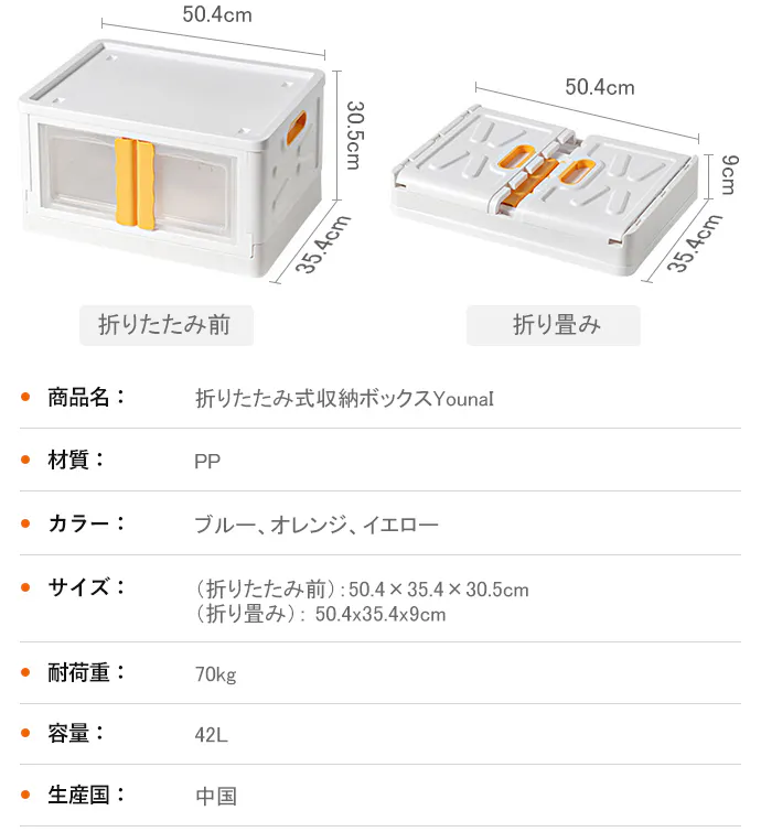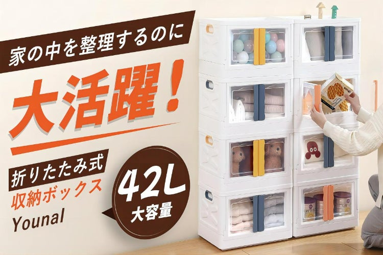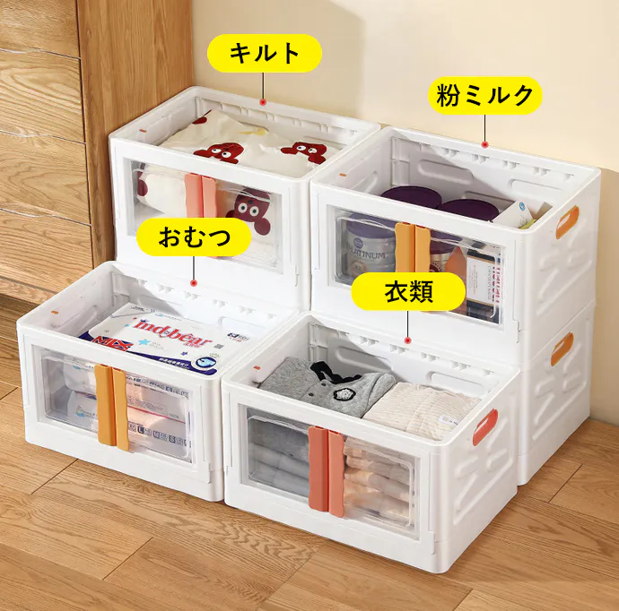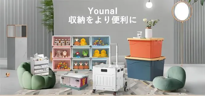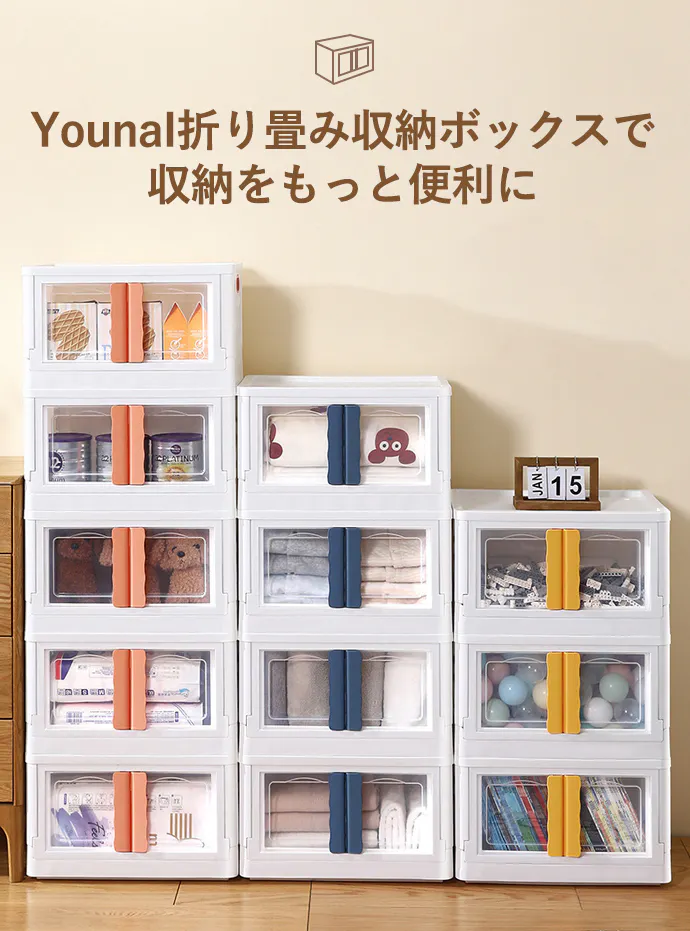 「YounaI」は、ブルー、オレンジ、イエローの3色展開で、おもちゃ、洋服、本、寝具など用途に合わせてものを分類できます。