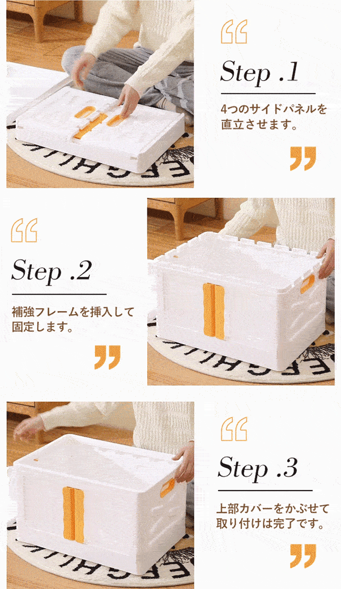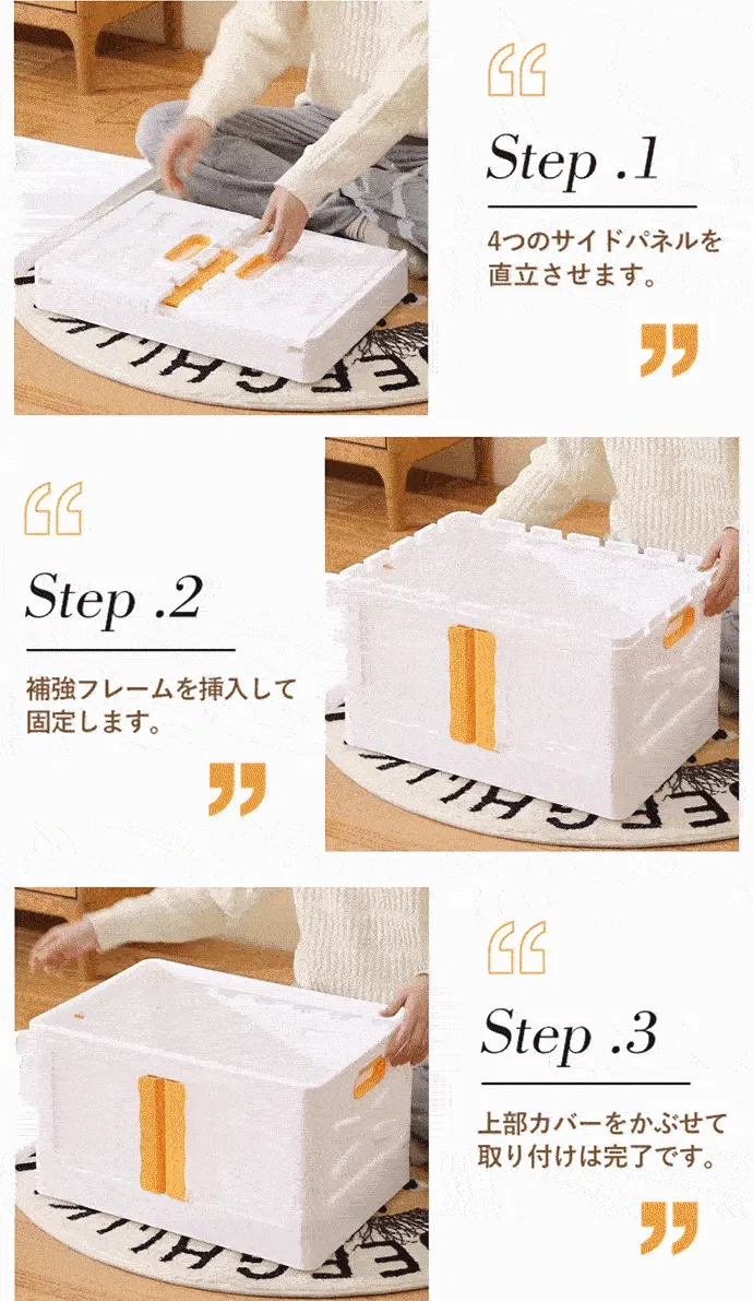 組み立て手順: 最初のステップ: 4つのサイドパネルを立てる。 2 番目のステップ: 補強フレームを挿入して固定する。 3 番目のステップ: トップカバーをはめて完成だ。