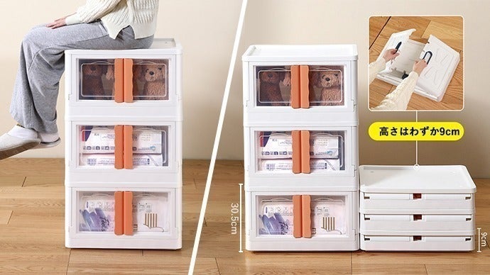 組み立てた時の高さは30.5cmですが、折りたたんで収納すると高さはわずか9cmで、あっという間に約3倍のスペースを節約でき、ベッドやワードローブの下に簡単に収納できます。