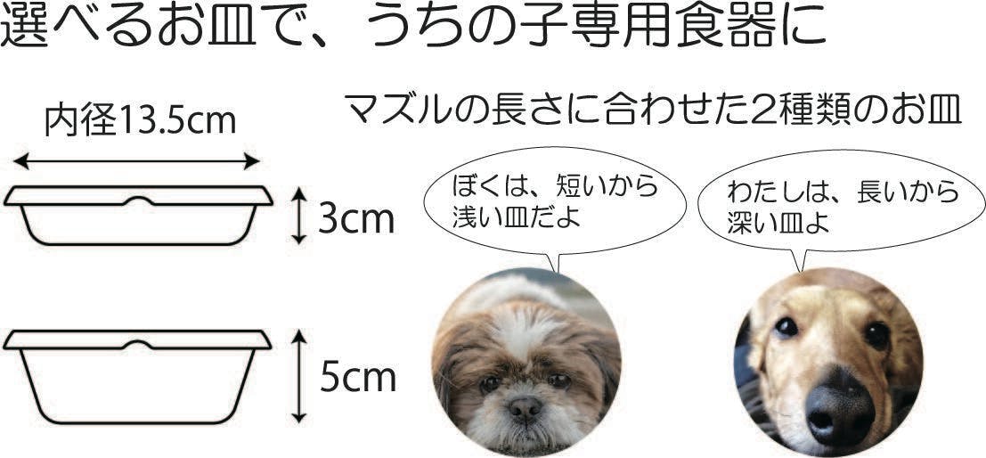 ワンちゃんのマズル(鼻)の長さに合わせた2種類のお皿を用意しています。