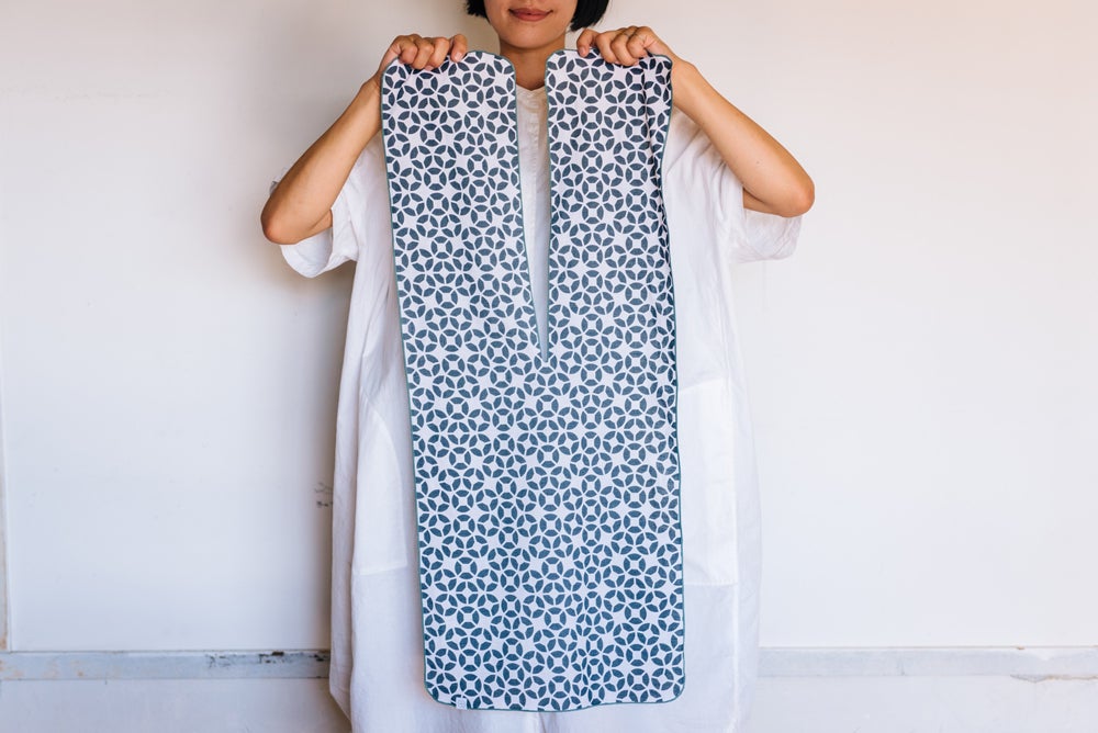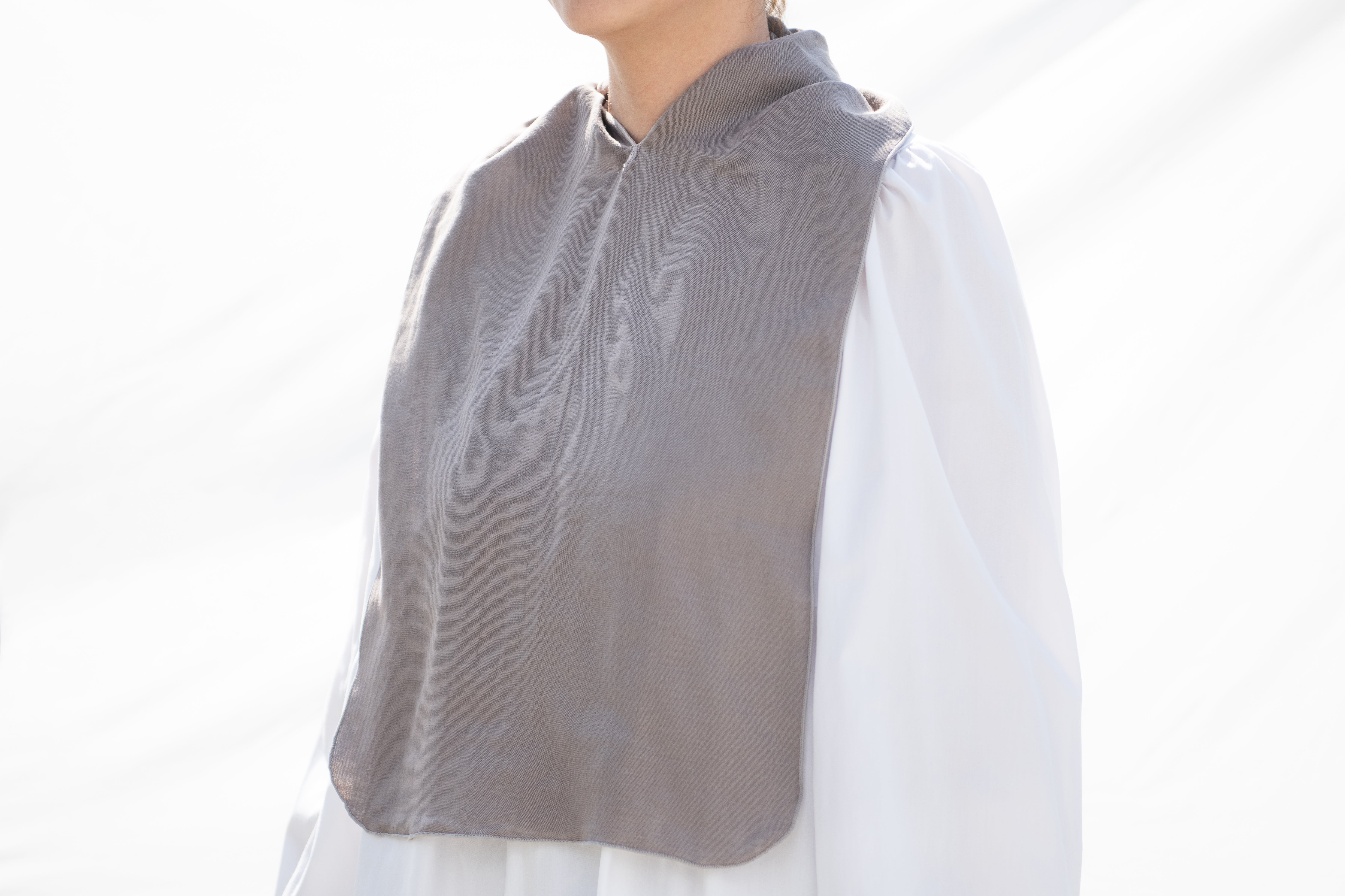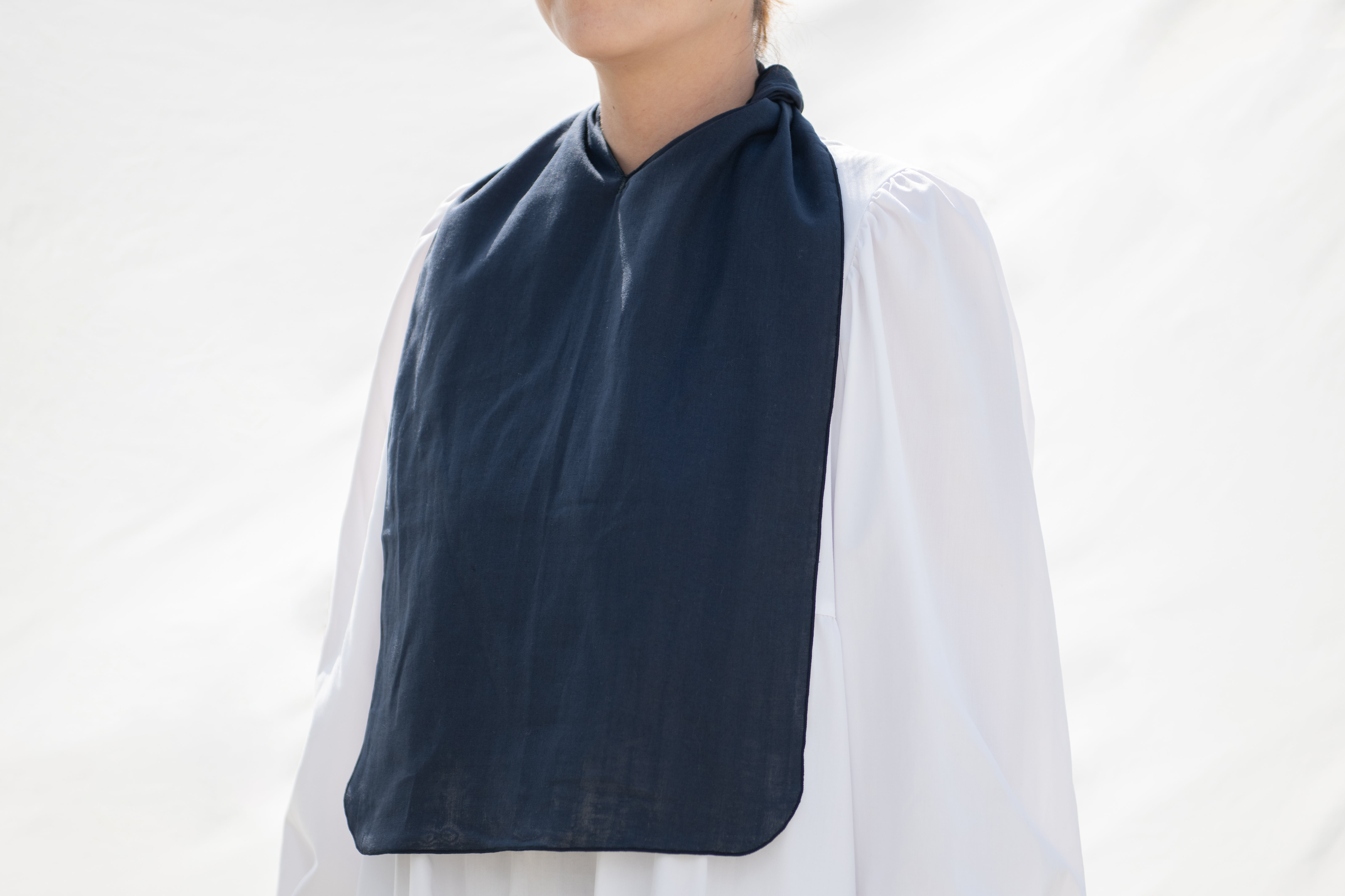 eptenuは不要な装飾や工程を省き、なるべくハギレが出ないデザインにしています。肩や首にかかる切れ目の箇所がポイントになっており、首元にしまったり、縛ったりするのに便利です。このV字の縫製は技術がないと綺麗に仕上げることが難しく、高い技術力と実績のある長野県のフレックスジャパン株式会社さんで縫製をしてもらっています。