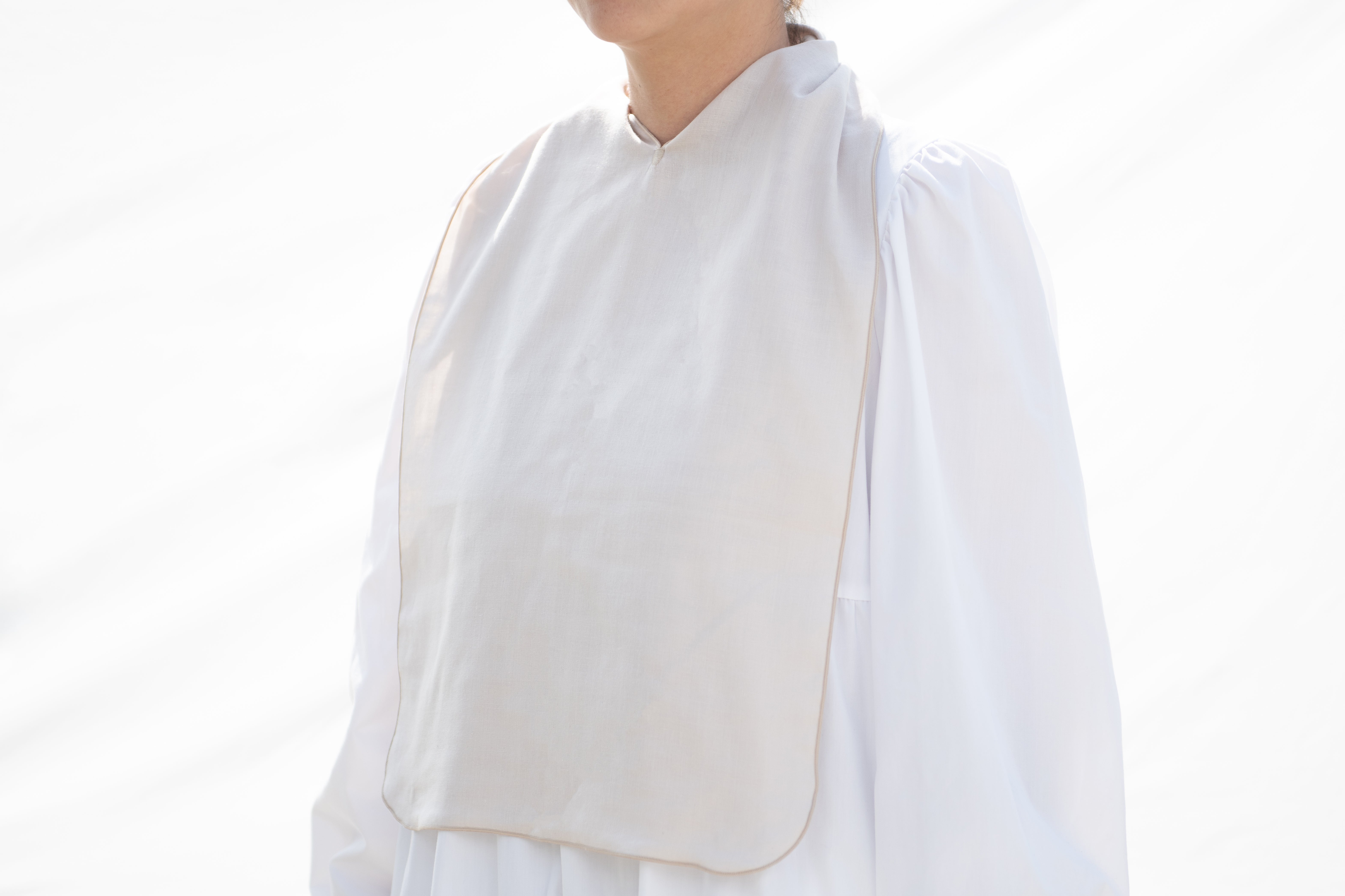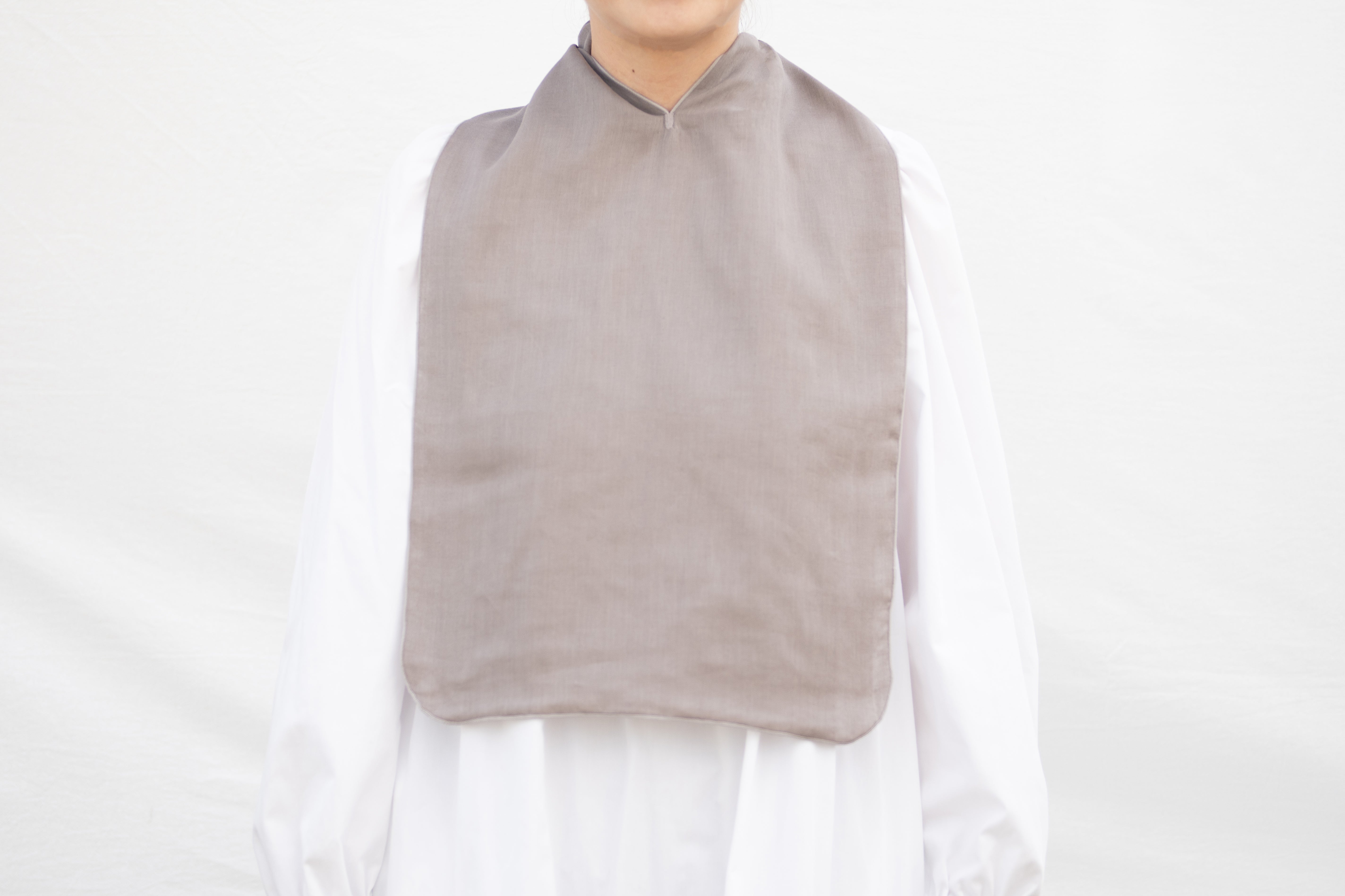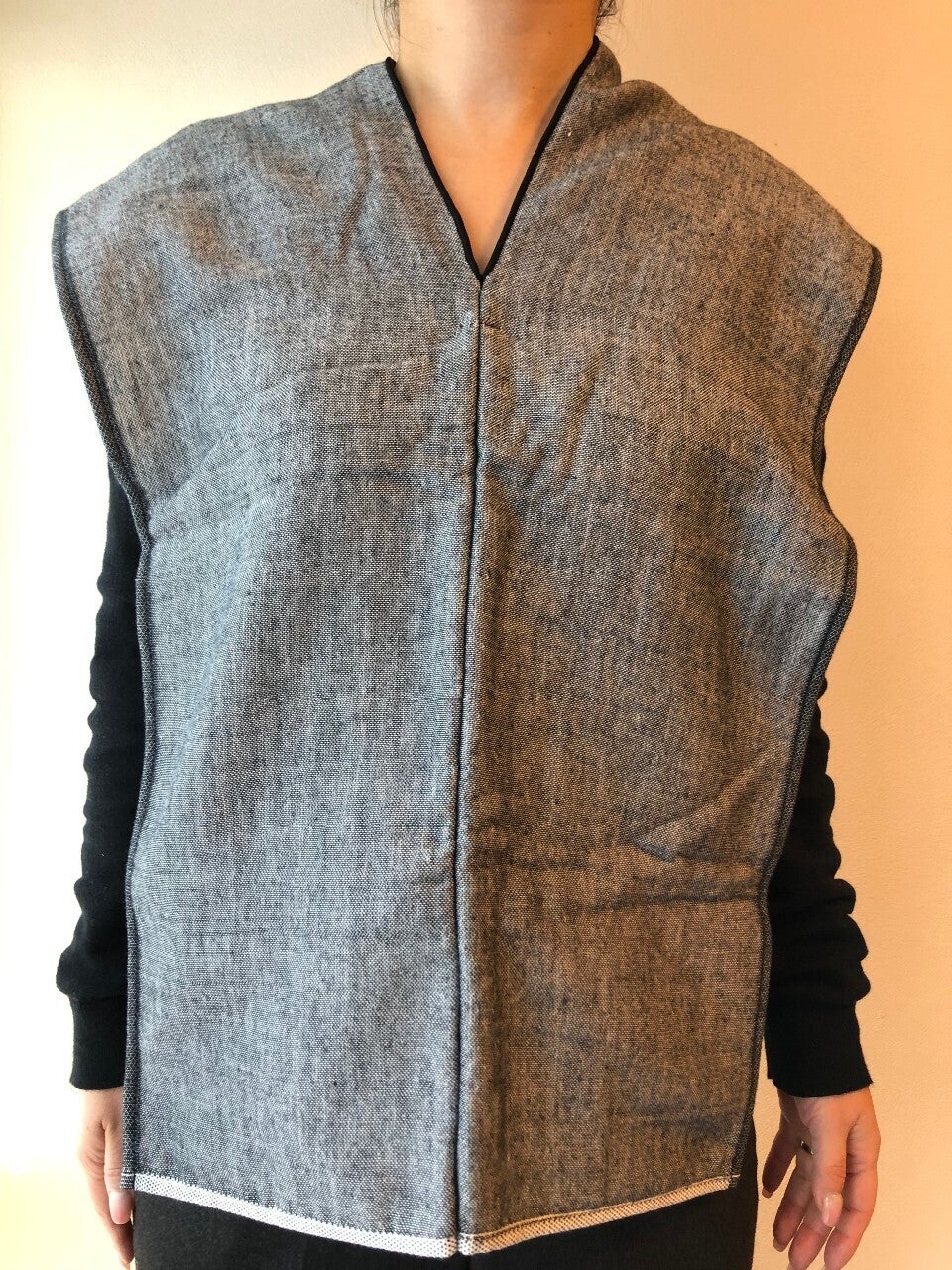 eptenuは不要な装飾や工程を省き、なるべくハギレが出ないデザインにしています。肩や首にかかる切れ目の箇所がポイントになっており、首元にしまったり、縛ったりするのに便利です。このV字の縫製は技術がないと綺麗に仕上げることが難しく、高い技術力と実績のある長野県のフレックスジャパン株式会社さんで縫製をしてもらっています。