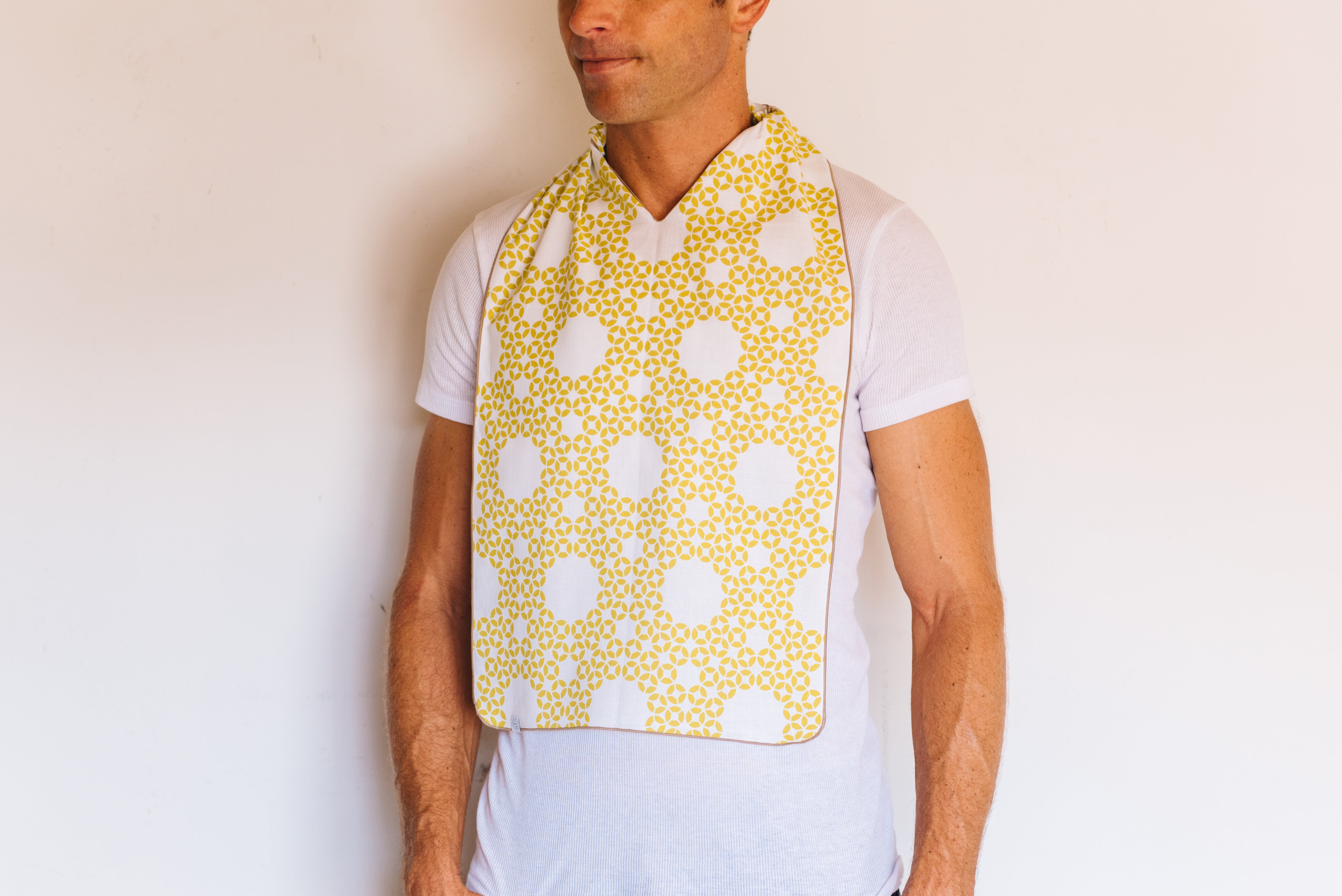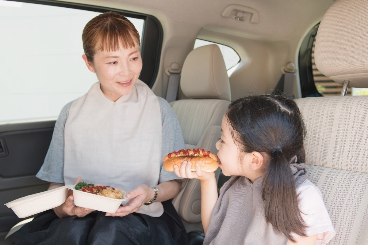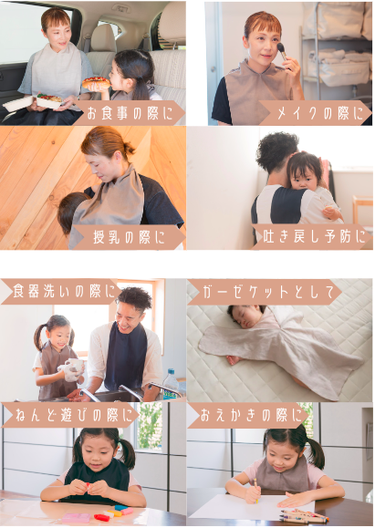 コンパクトで軽量なので、普段はハンカチとして持ち歩き、お食事の際にはエプロンとしても使用できる多機能エプロンです。お子様とのお食事の際にもさっと首につけられて親子でシェアできます。また、お子様のファーストエプロンとして、お料理や食器洗いなど、ご家庭でのお手伝いの際にご使用いただいたり、子どもから大人までご家族でご使用いただけるエプロンとして多くのご家族にご愛用いただきたいと思います。