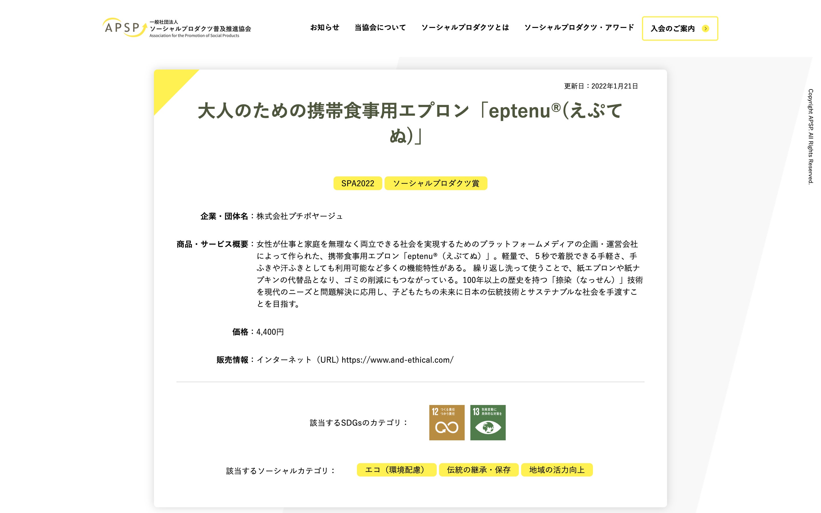 一般社団法人ソーシャルプロダクツ普及推進協会主催のソーシャルプロダクツ・アワード2022にて『&ethical®︎(アンドエシカル®︎)』の携帯食事用エプロンeptenu®︎(えぷてぬ)がソーシャルプロダクツ賞 を受賞致しました。
