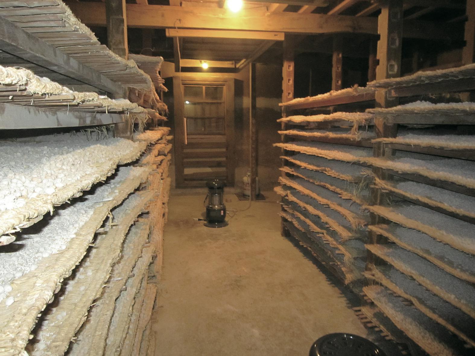 既存の設備。例えば、むしろ。麹を育てるのに欠かす事ができない物ですが、麹造りに適した昔ながらのむしろを手に入れる事はとても難しくなってきています。昔は農家の方が閑散期に道具を使い、編んでくれていたのですが、今ではほとんど作られておらず、流通しているむしろは機械編みの物がほとんどになってきており、機械編みの物は編み目が粗く、傷むのが早く、何度も失敗した事も有り、麹造りにはあまり適していないように感じます。そこで弊社ではSNS等でむしろを必要としている事を告知して、使わなくなったむしろを持っている方の情報を頂き、遠い所では奈良県まで頂戴しにお伺いした事も有ります。