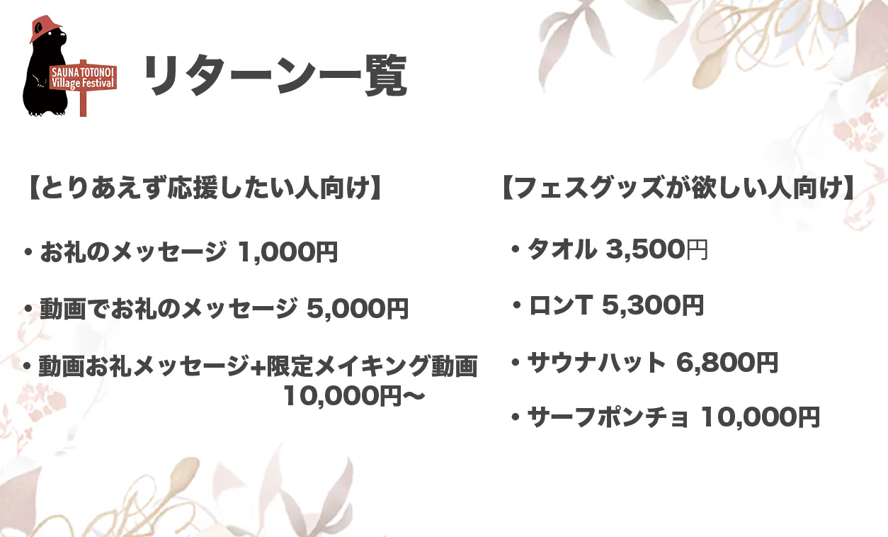 リターンには少しお得な入場券から遠方の方にもご支援いただけるクラウドファンディング限定販売の公式グッズやお礼のメッセージ動画のご用意もしております。