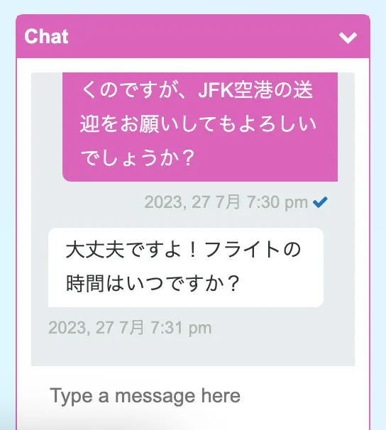 (実際のチャット画面、メッセージを受け取るとメールアドレスに通知が来ます)