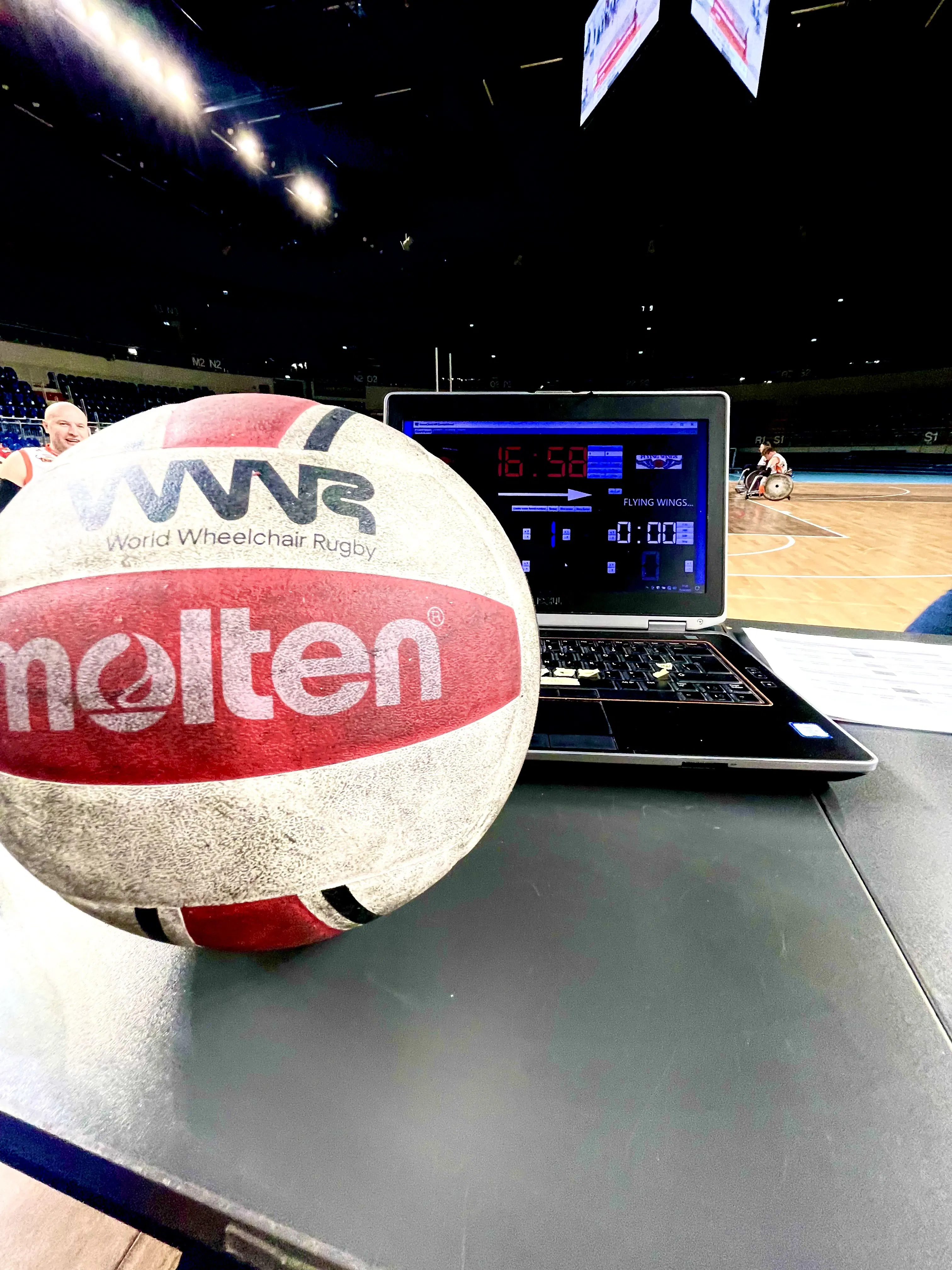 (初めてのテーブルオフィシャル。ちなみに、車いすラグビーのボールはバレーボールを元に作られています。まん丸です。)