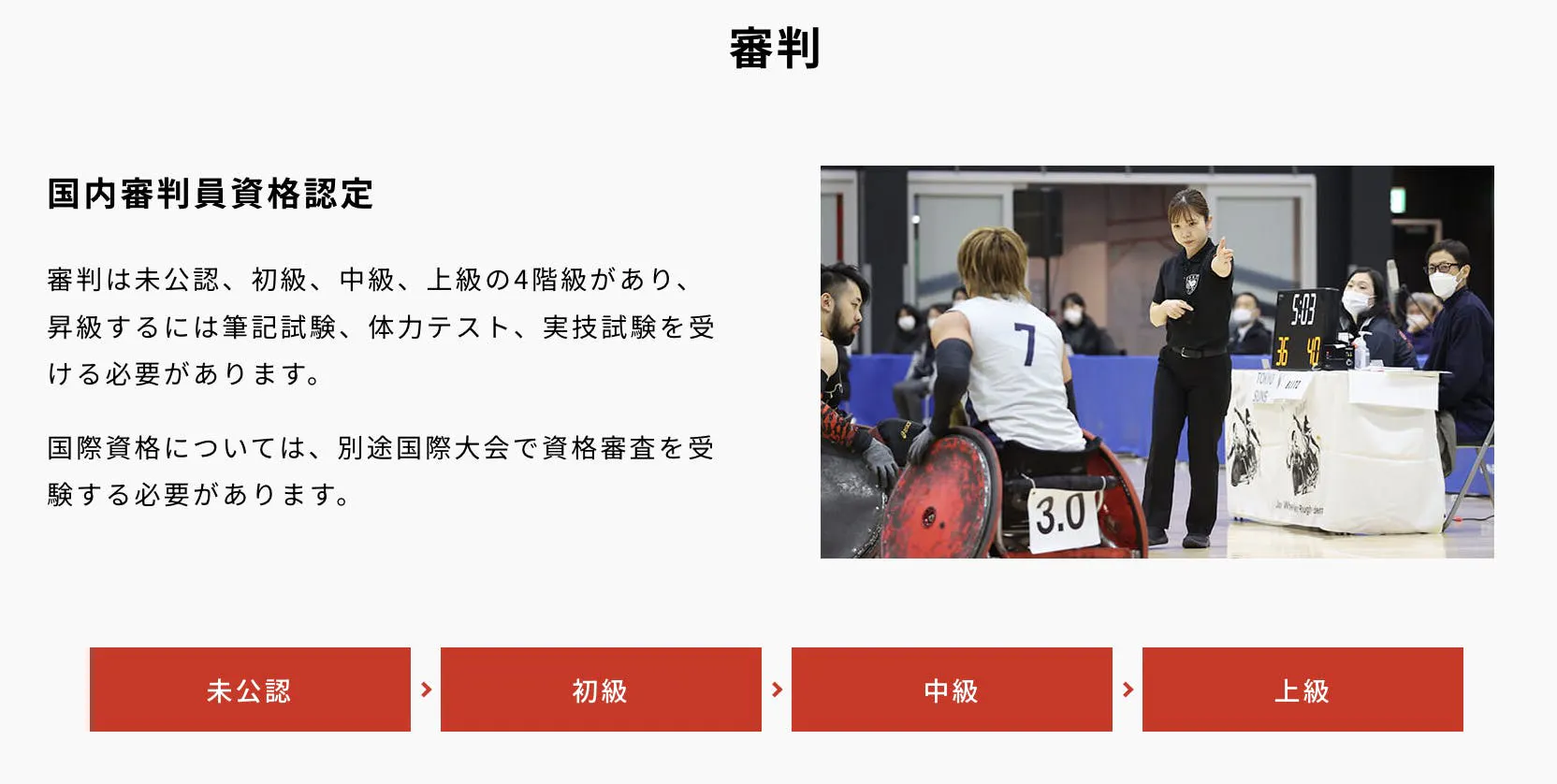 現在、日本人が車いすラグビーの国際審判になるためには以下の2つの条件があります。