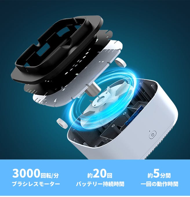 3000回転/分のブラシレスモーターで、強い吸い着力で、他の人に迷惑にならないようにタバコの煙を吸い取ります