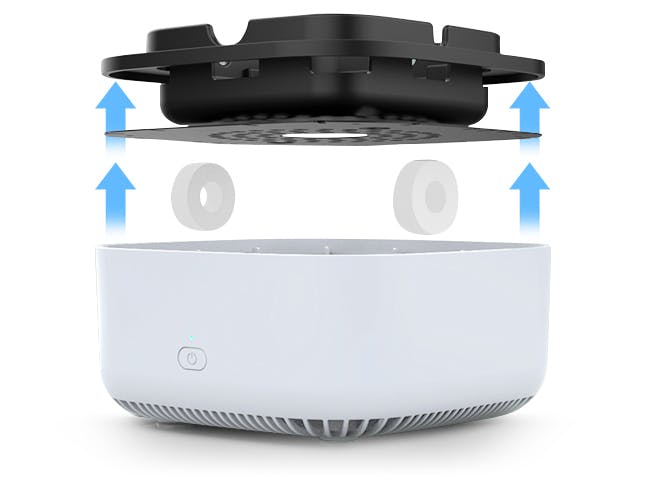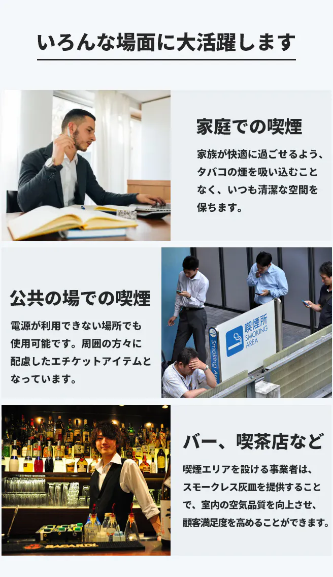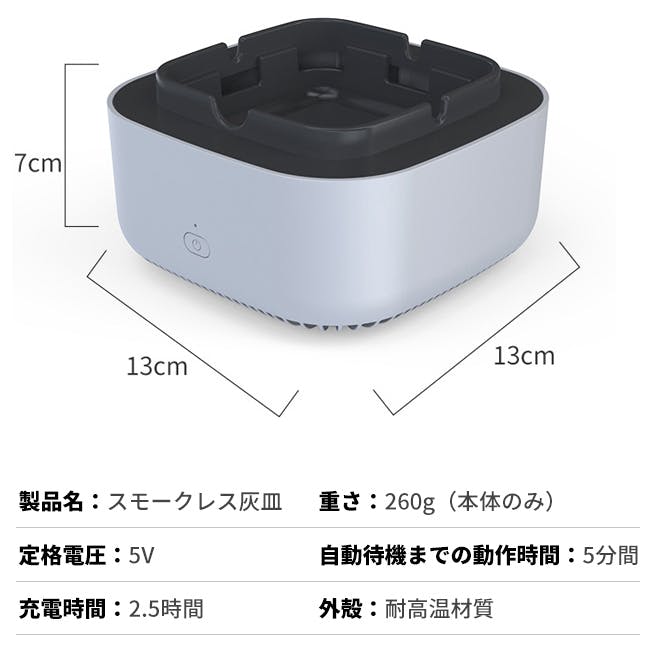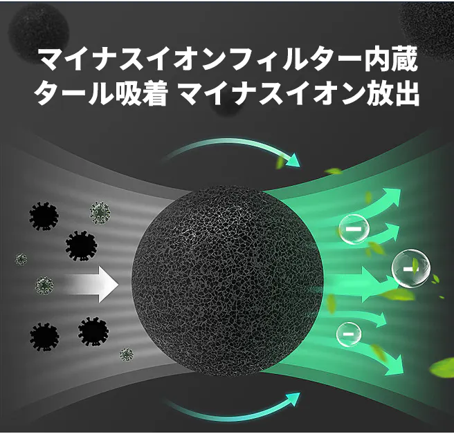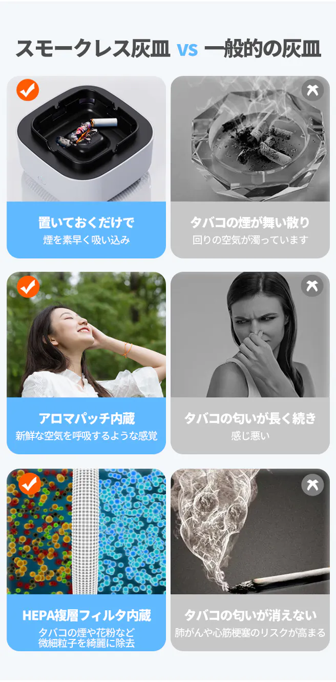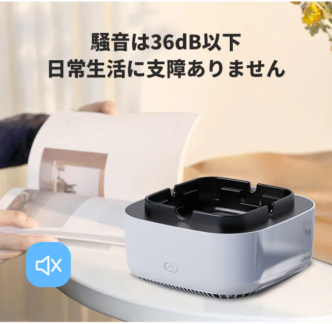 A:スモークレス灰皿は内蔵のフィルターで空気を浄化し、マイナスイオンを放出します。