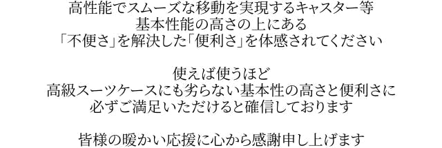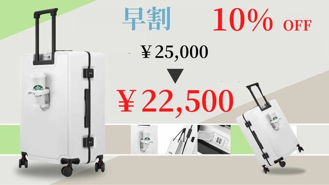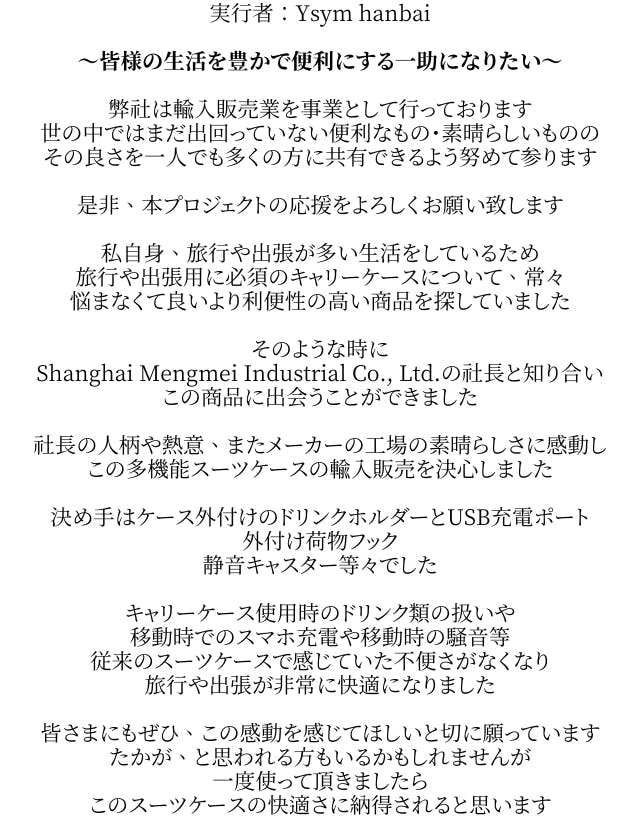 2023/09/09 17:49初めまして、実行者のYsymhanbaiです。この度、スーツケースを販売開始させて頂きました。この商品は以前にもマクアケさんで非常に多くのご支援を頂きました。ケースの外側にカップホルダー、フックや充電用ポートが付いていて、ハンズフリーとなることでの食べ歩きや、スマホ充電等が可能になります。また、頑丈なボディ、安心のTSAロック、静かな車輪、沢山の収納等々、ハイスペック、ストレスフリーとなる優れものです。旅行や出張だけでなく、少し荷物の多い通勤通学にも役に立ちます。多くの方々から、ご好評を頂きました。10月末までの期間で、始まったばかりです。これから、宜しくお願い致します。 もっと見る