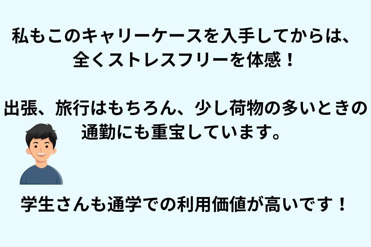 2023/09/12 02:47昨日は少し荷物が多く、いつものビジネスバッグでは入らなかったので、「はい、出番です!」とばかりに、このケースを取り出し、荷造りをしました。十分入るし、少し重たい書類もありましたが、もちろん持ち運ばすケースを引いての移動なので、「楽な通勤でした!」帰宅時にはスマホの充電も出来ましたし、静かな車輪で音にも気にせず、とても頼りになります。学生さんは通学にも活用頂ければと思います。宜しくお願い致します。Ysymhanbai もっと見る