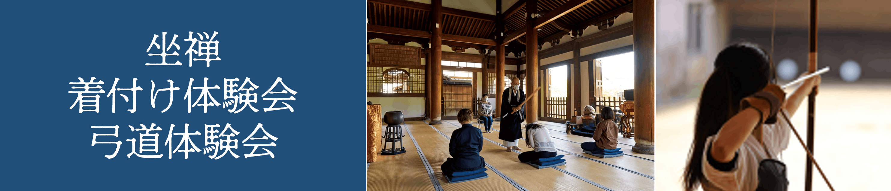 着物の着付けなど、見る、だけでなく自身で日本文化に触れて体験をしていただき、より日本文化への深耕を味わっていただきたいと考えております。今回は坐禅、着物の着付け体験、弓道体験をご用意しております。
