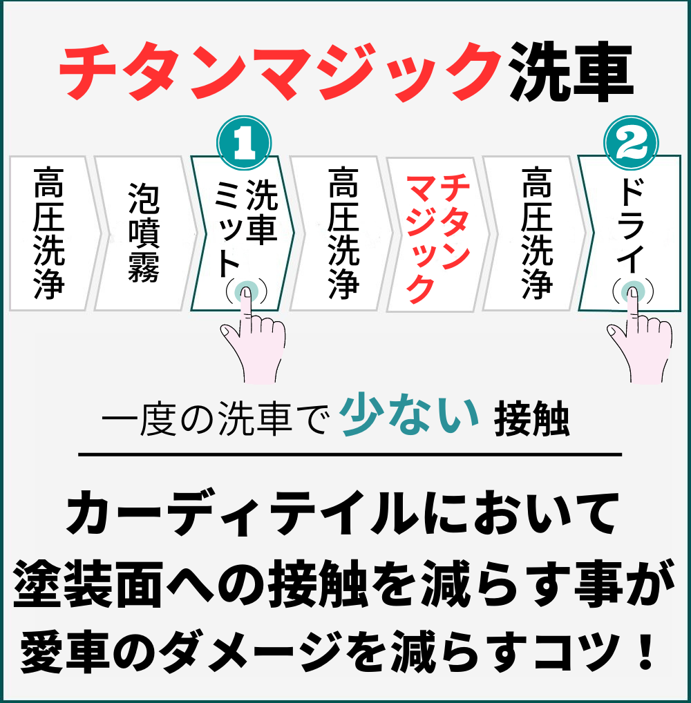 強い日差しの下やボディ表面が熱い時は作業せず、日陰作業がおすすめです。スプレー後、タオルではなく水でパフィングする感覚で、高圧洗浄で十分に洗うと光反射とコーティング効果がより高まります。チタンマジックは水に反応するハイエンドコーティング剤です。