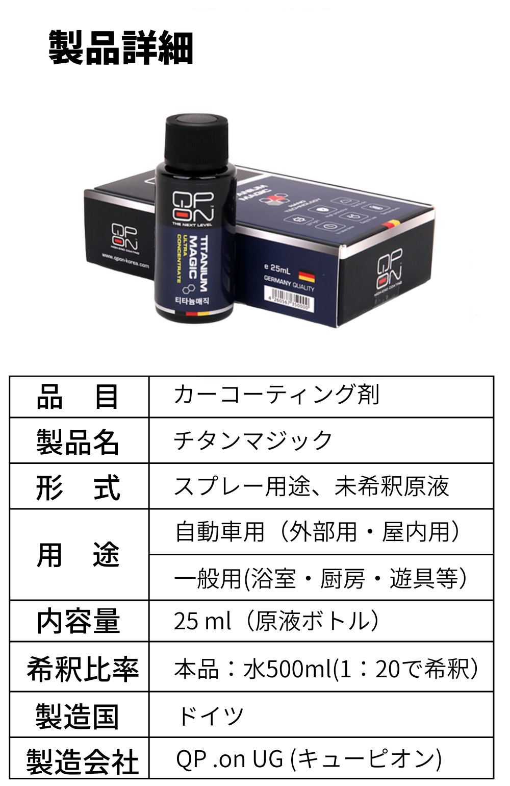 ドイツQPON社のクォリティーを採用し「チタンマジック」が生まれました。車の全パーツにコーティングができるように企画・製造しています。我々は今後も愛車を守る防汚性、手軽な作業性、効果の持続性を追求し、皆様の快適な車の運転に役立つための物作りに努力を惜しみません。今後ともご支援宜しくお願い申し上げます。