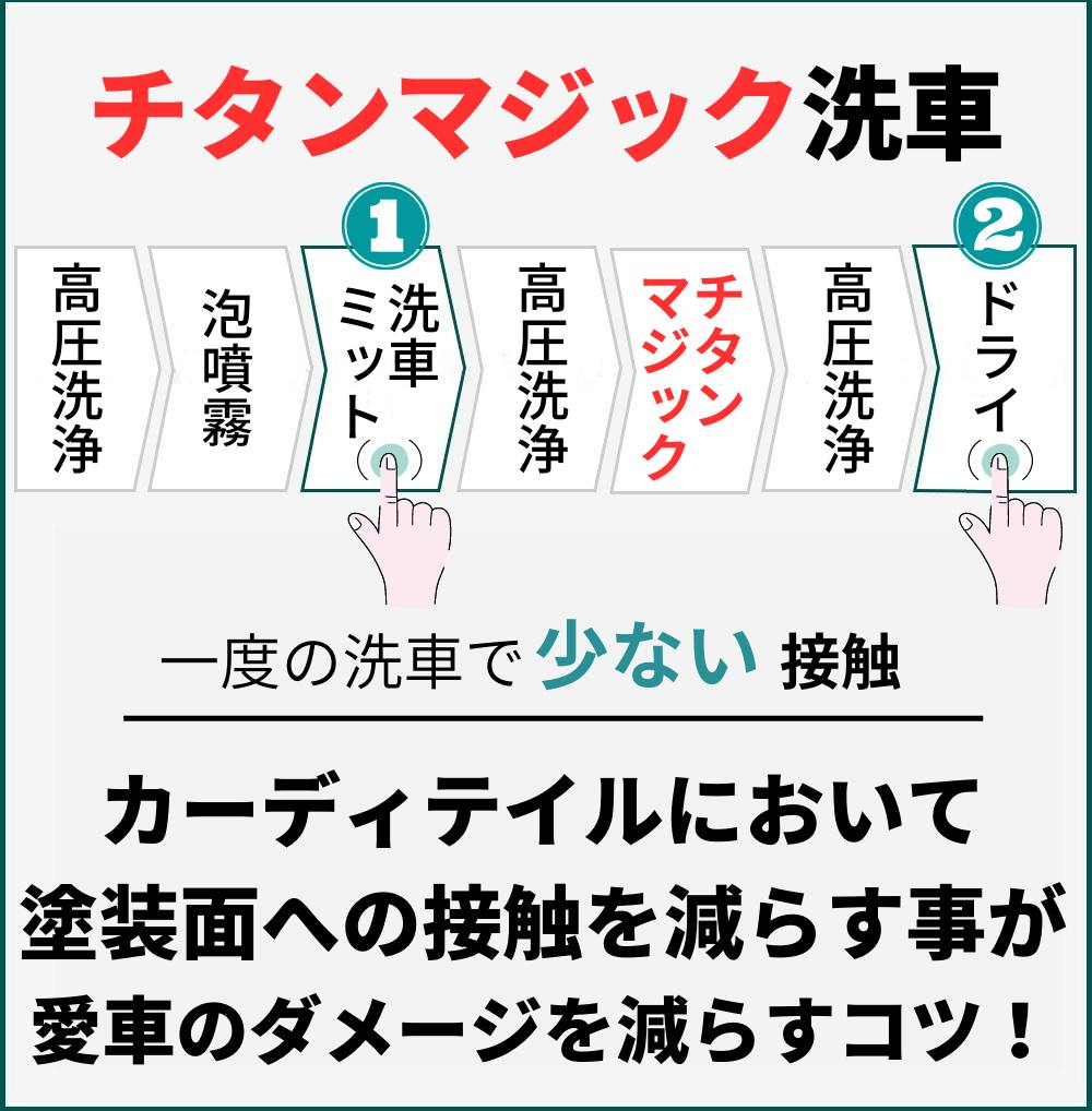 湿式と乾式を組み合わせたコーティングができます。水分のある表面にチタンマジックを噴射し、濡れタオルでコーティング剤を塗り伸ばすように拭き上げます。タオルが濡れたら水分を絞りながら(脱水バフィング)やさしく拭いていきます。バッフィングとドライを一緒にすると考えながら作業してください。乾いたタオルで仕上げた後、自然乾燥させてください。光反射を極大化させます。
