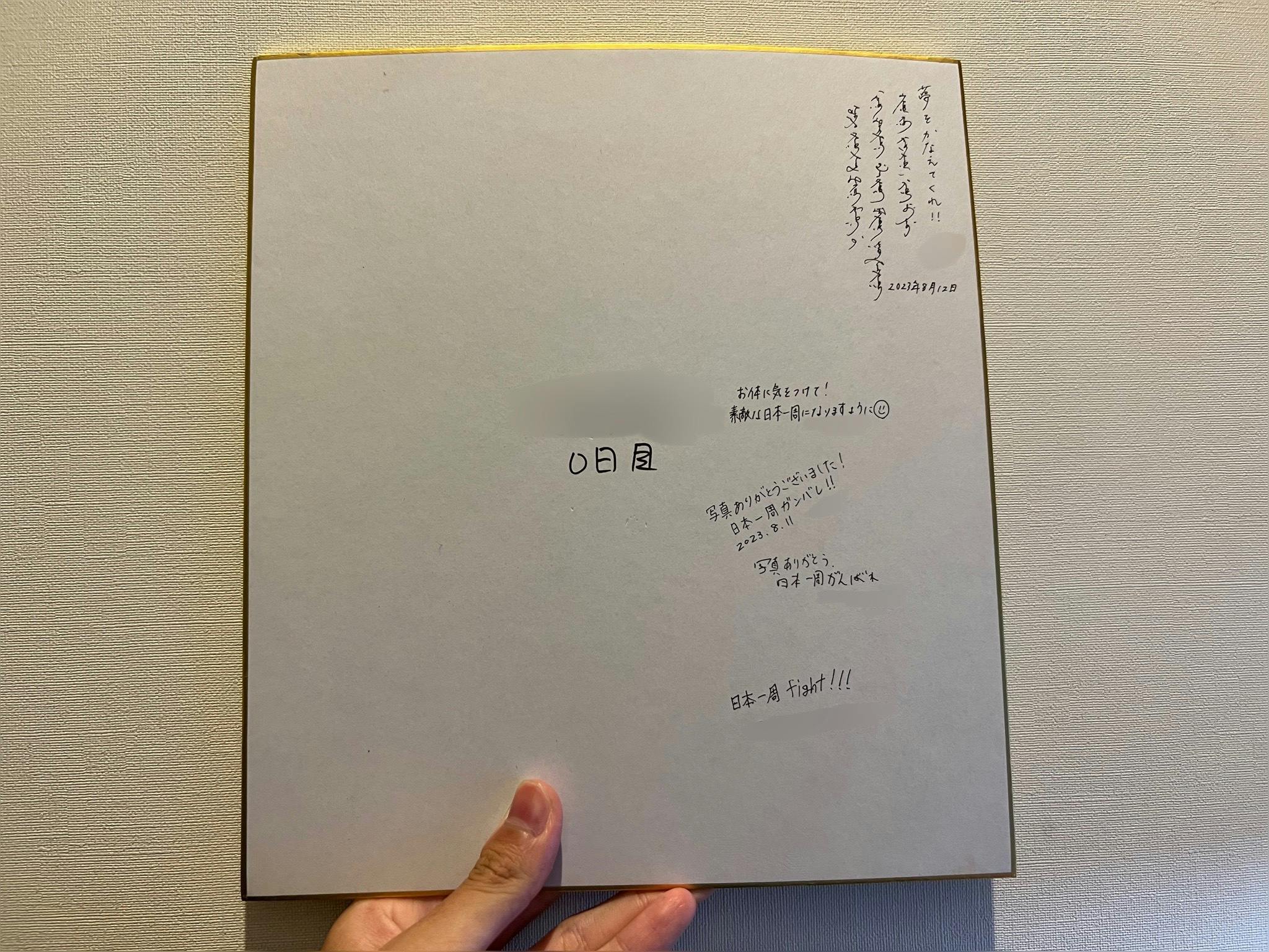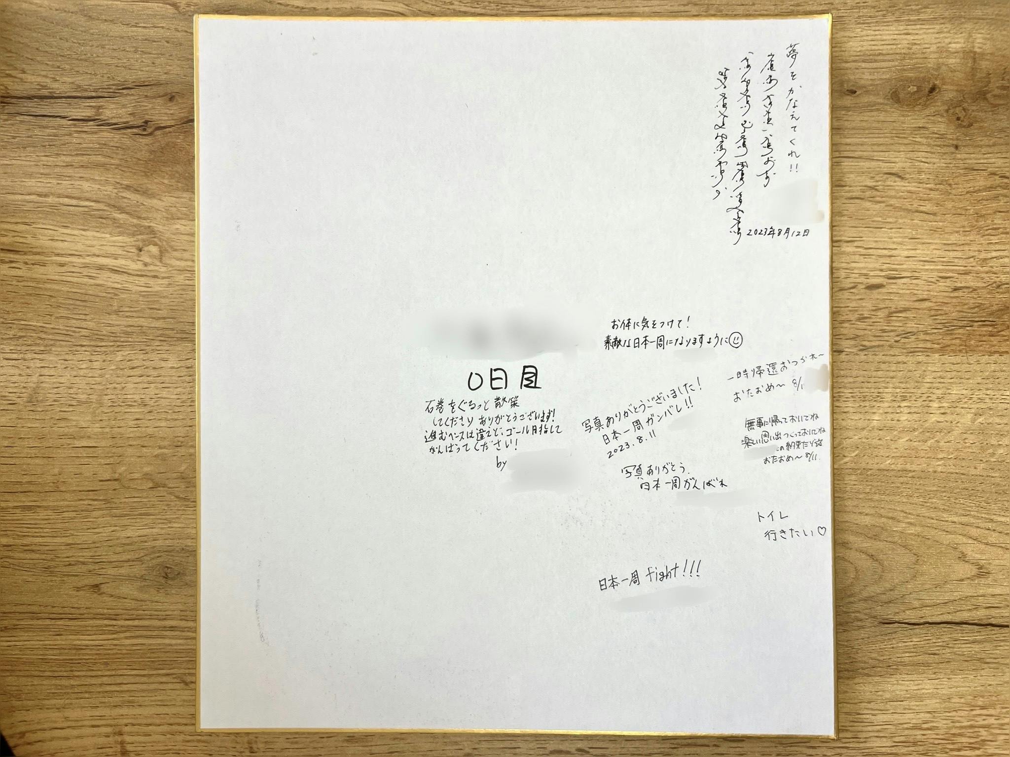 旅ならではの交流を増やすという目標を達成し、形として残すために、今回の旅では何らかのご縁で私と交流し、お時間がある方には、「最長片道きっぷ限界旅」をする私に対しての応援メッセージを、私が持ち歩いている色紙に記入していってもらっています。これは、旅の道中苦しくなった時に見返すのはもちろん、旅が終了後にも自宅に飾っておこうと考えているため、いつでもこの旅のことや出会った人々のことを思い出せると考えると同時に、やはり多くの方からのメッセージがあればあるほど、私のモチベーションにもつながると考えたため、実施しております。
