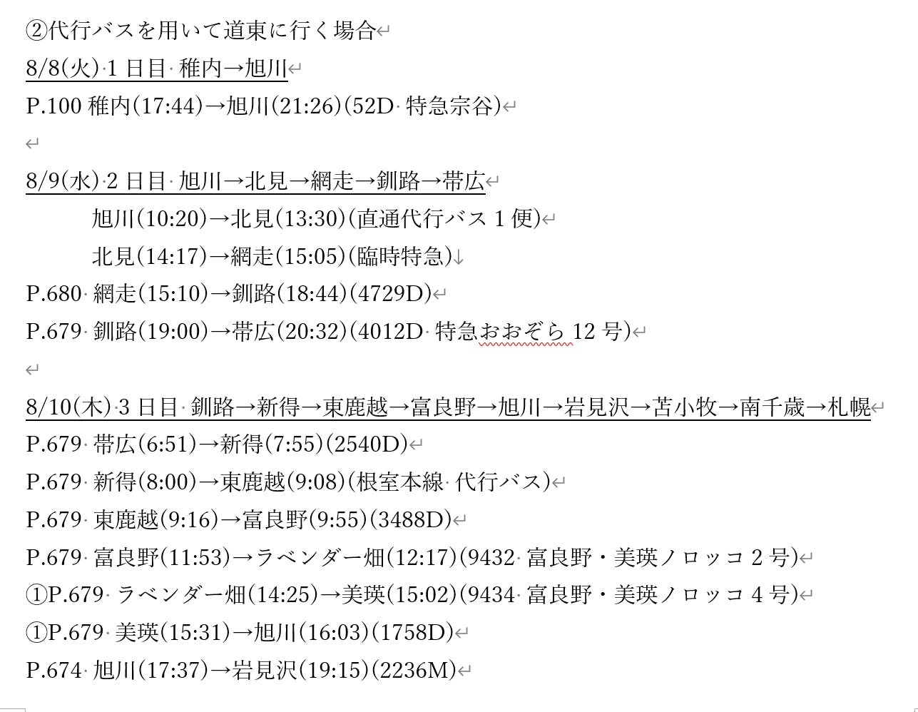 予定立て直しの際のベースとなっている当初の行程表をスキャンし、PDFファイルで送付させていただきます。ダイヤの変更、または災害・廃線等による路線の分断がない限り、この行程の通りに進めば、最長片道切符は完走できると考えております。