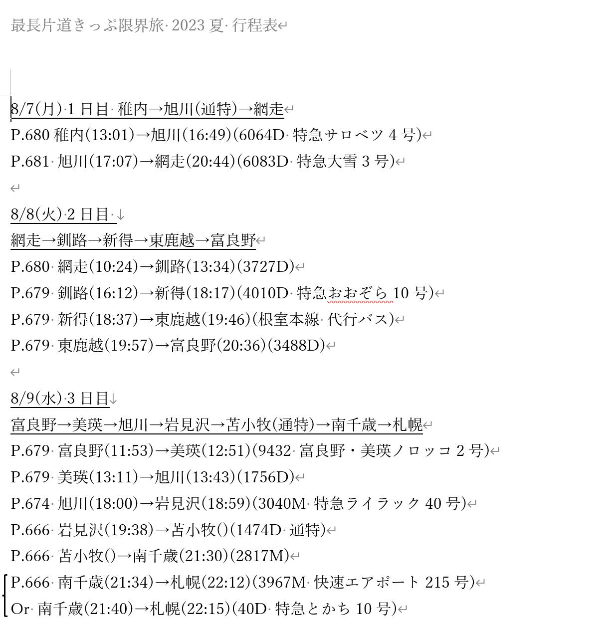 最長片道きっぷ限界旅出発前、2023年6・7月に作成した手書きの行程表をすべて公開します。旅が始まった今、当初の予定とは大幅にずれていますが、極力当初の予定に戻せるよう、日々行程を練り直し、進んでいます。