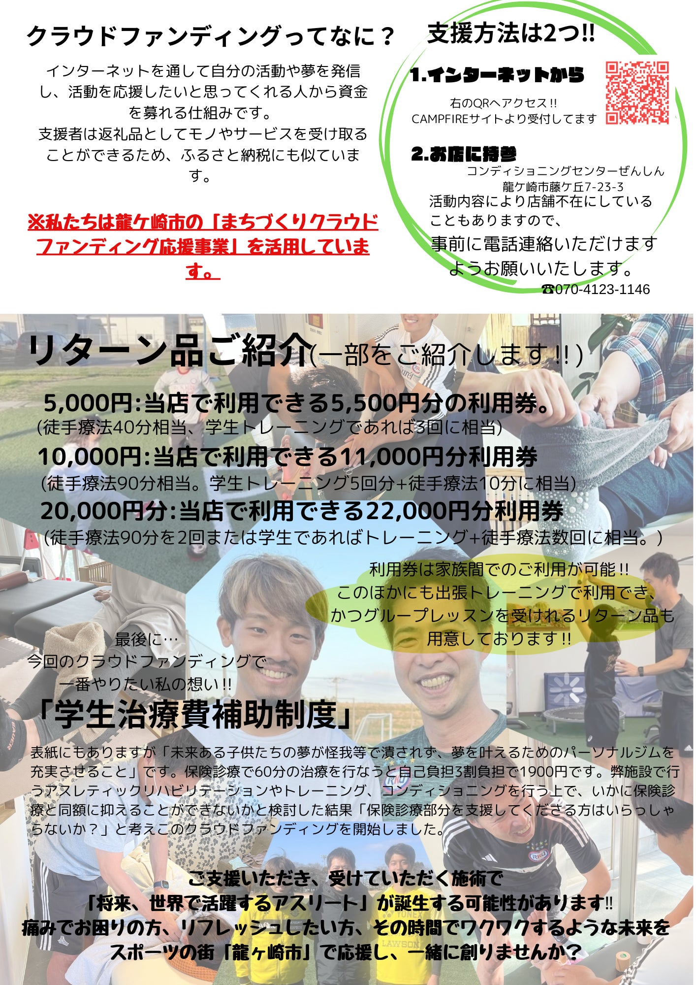 今回ご支援いただきます支援金の一部は「学生治療費補助制度」に活用させていただきます。ご支援いただき、受けていただく施術で「将来、世界で活躍するアスリート」が誕生する可能性があります!!痛みでお困りの方、リフレッシュしたい方、その時間でワクワクするような未来をスポーツの街「龍ケ崎市」で応援し、一緒に創りませんか?皆様からのご支援お待ちしております!!どうぞよろしくお願いいたします。