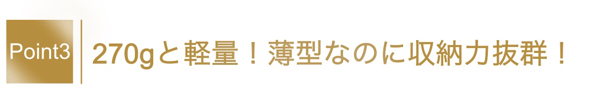 キーケースやモバイルバッテリーなどバッグの中がごちゃつきがちな小物もスッキリと収納できます。マチは3cmと薄型なのに抜群の収納力!