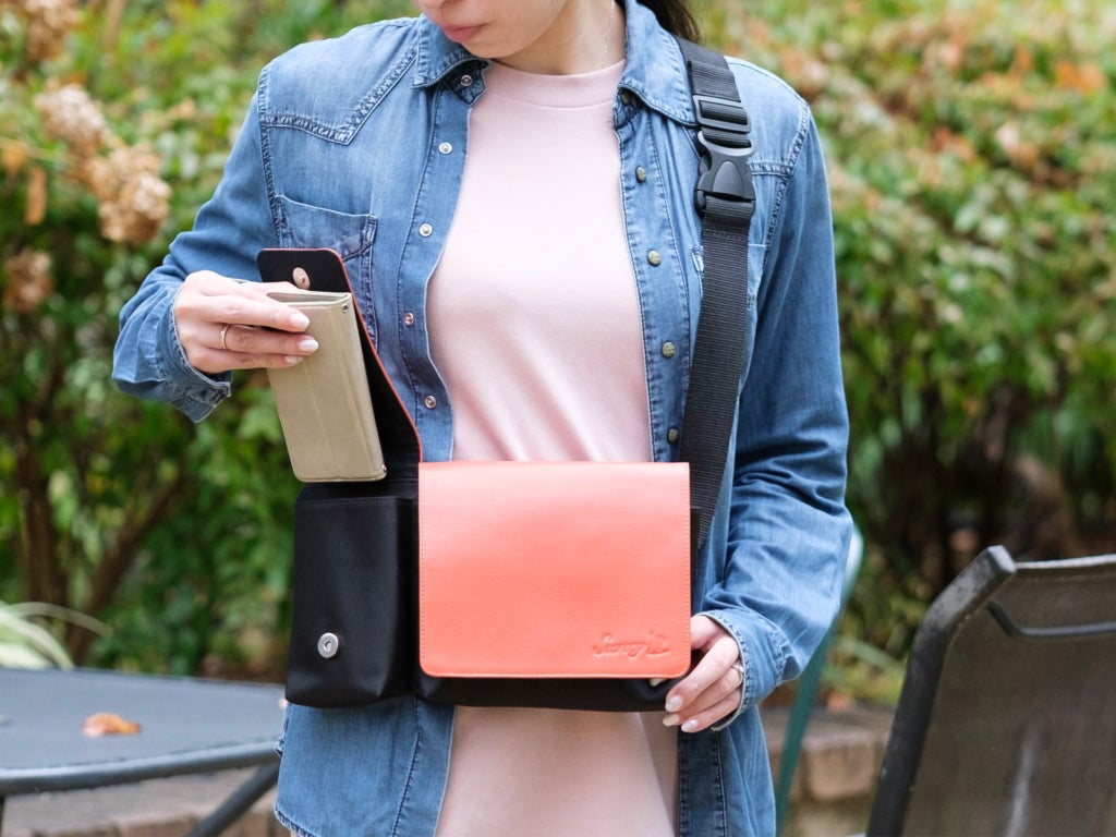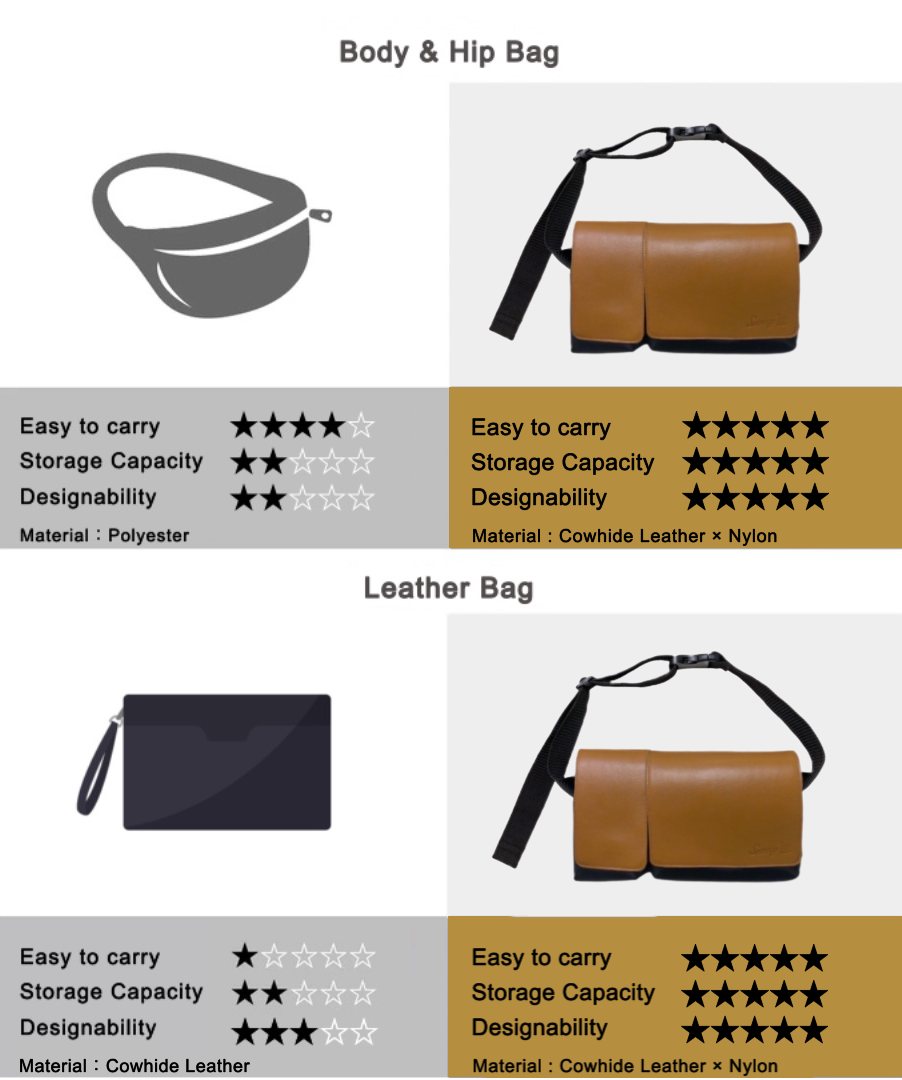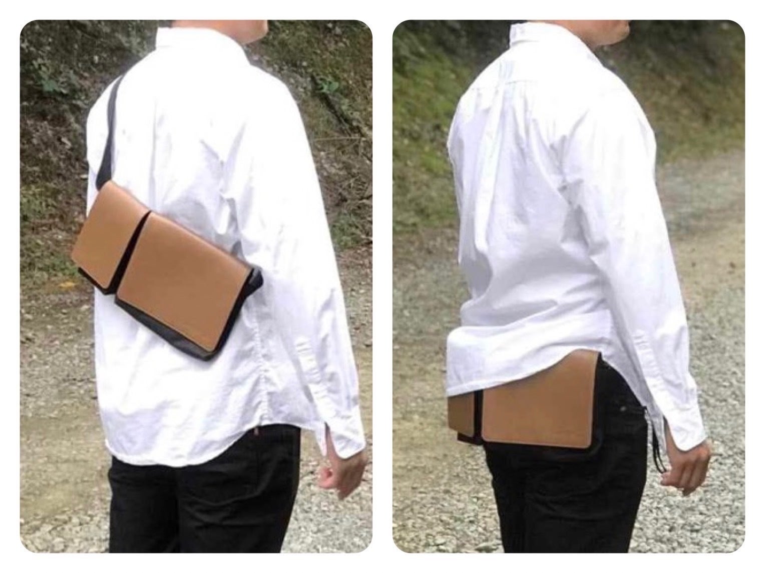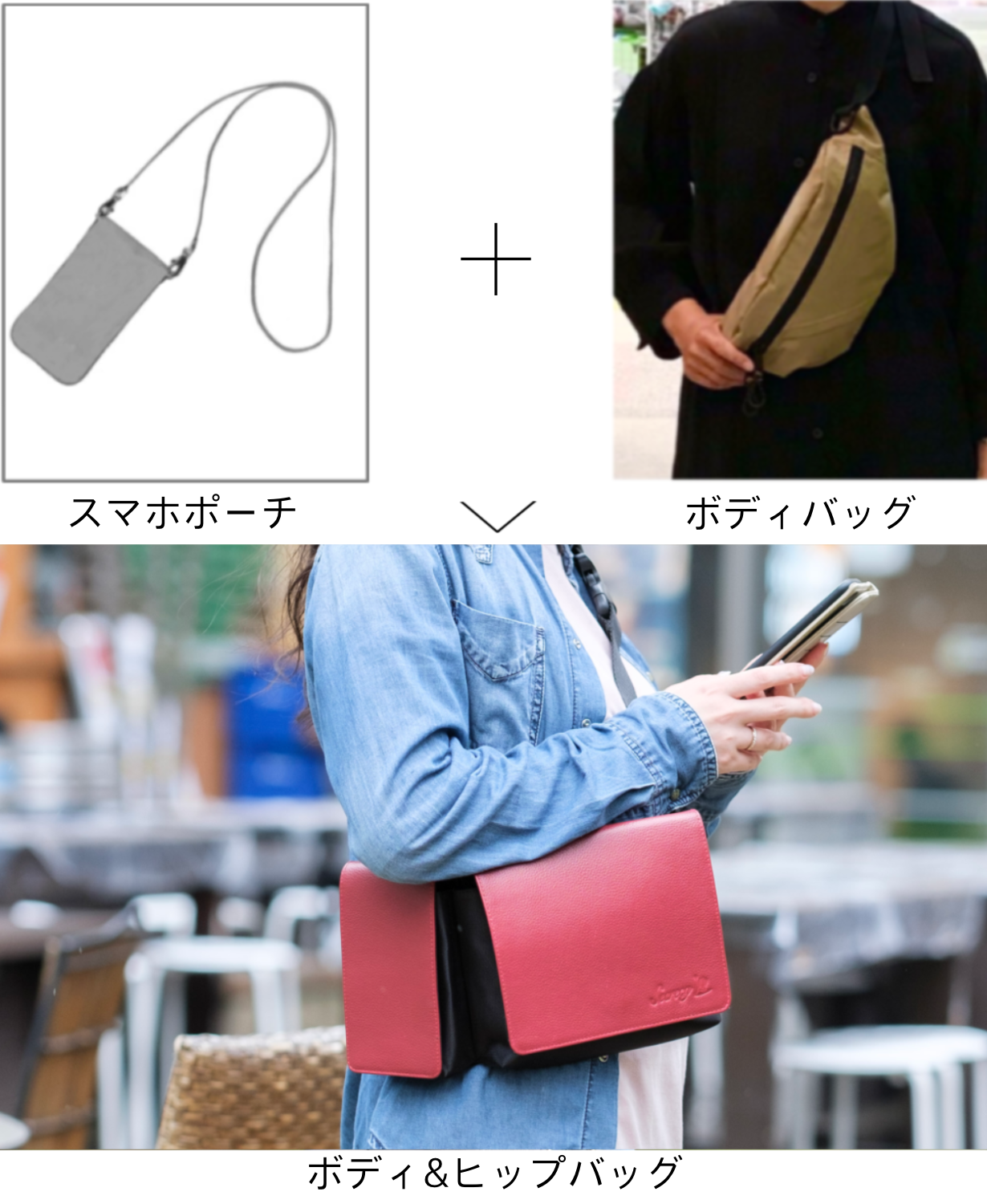 ナイロン×牛革の『ボディ&ヒップバッグ』は、「スマホポーチ」と「ボディバッグ」を1つにした新しいデザインです。
