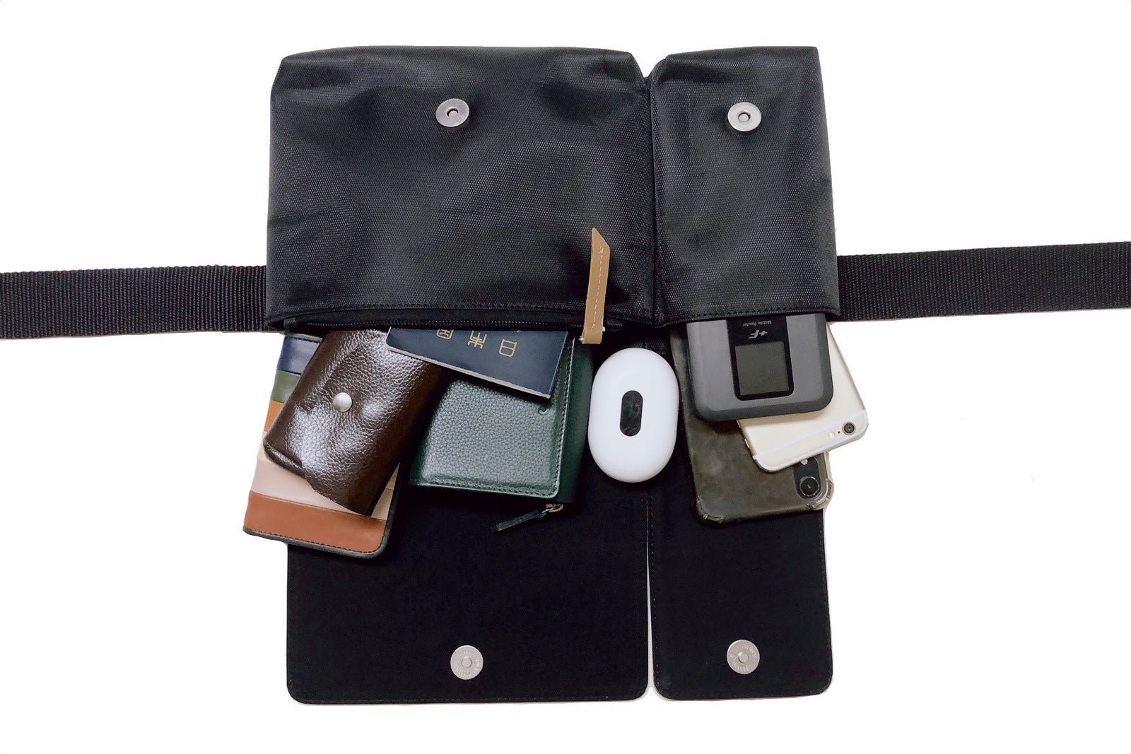 2つの独立したポケットを持つ『ボディ&ヒップバッグ』。ありそうでなかったスマホサイズのポケット&必需品をたっぷり収納できるポケットがあり、フラップは上質な牛革を使用した超軽量のバッグに仕上げました。シンプルなデザインはアウトドアは勿論、様々なシーンでご愛用いただけるジェンダーレスのバッグです。