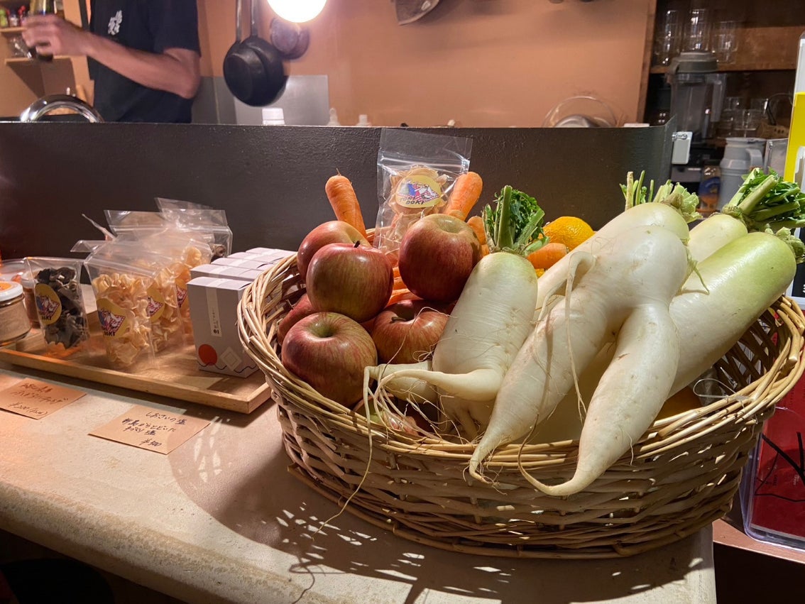 全25席程の店内には、パートナー農家様が送ってくれた規格外のお野菜をディスプレイし、