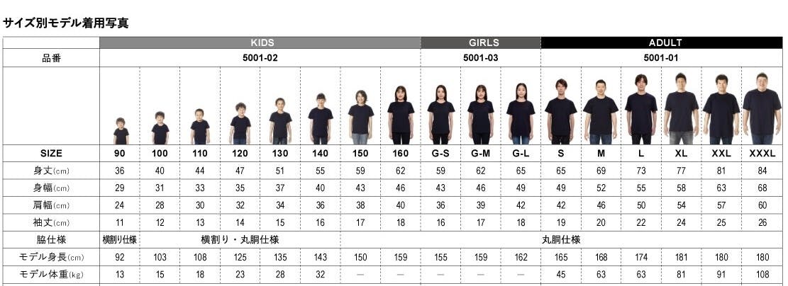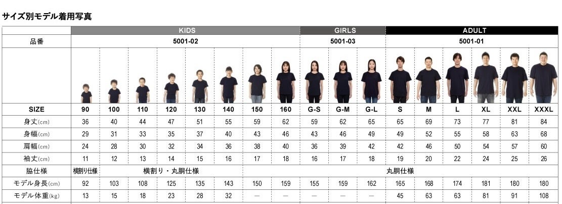 Tシャツのサイズ表のお知らせ