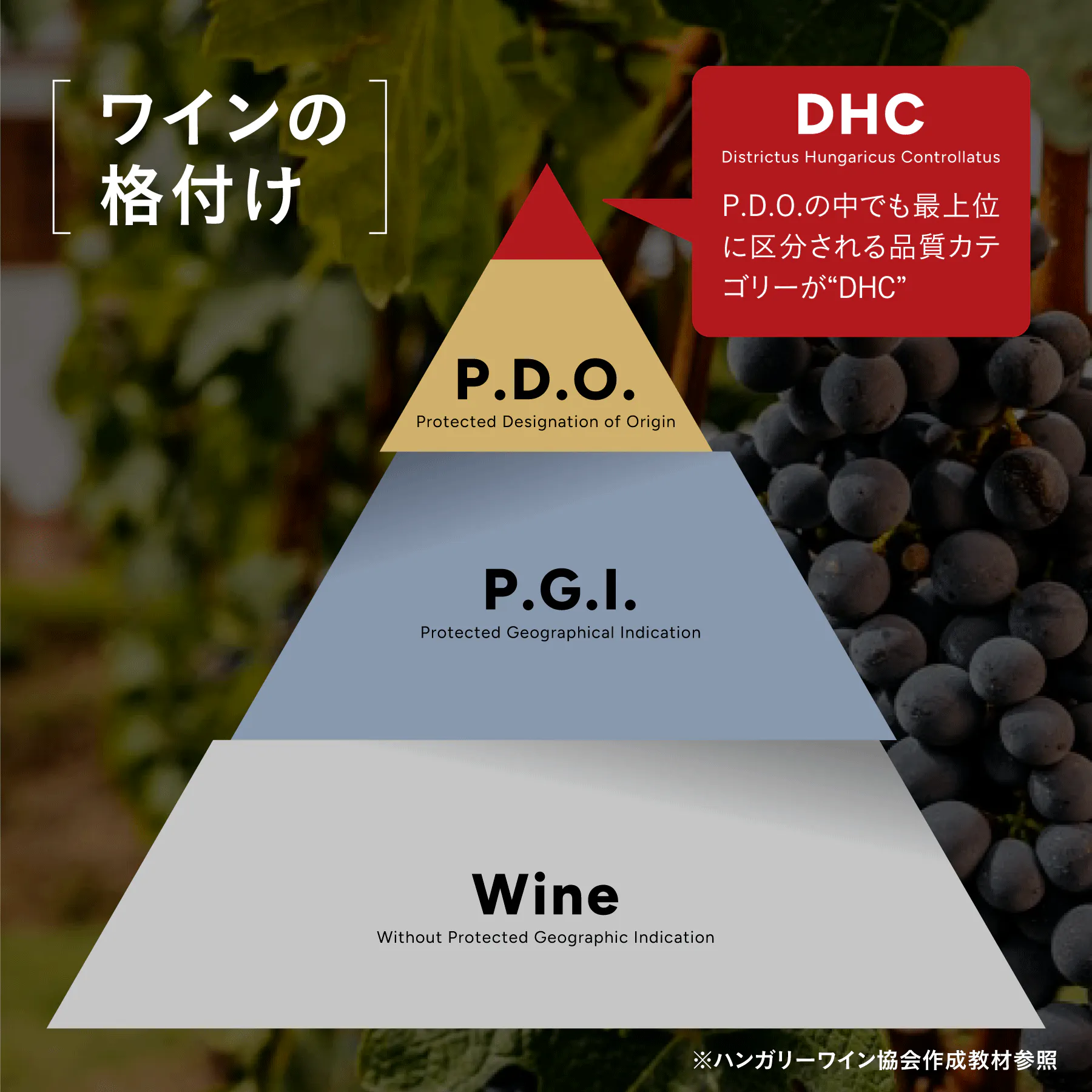 ハンガリー・制御された区域のワインのことを指す。2003年にハンガリー国内で最も厳しい品質管理を規定するために導入されたのが D.H.C.(ディストリクトゥスフンガリクス・コントロラートゥス:Districtus Hungaricus Controllatus) です。P.D.O.の中でも最上位に区分される品質カテゴリーであり、ハンガリーの消費者の間では、D.H.C.の商標があると高品質であることが分かるため、 年々、D.H.C.を重視する傾向が高くなっています。これらの規則は栽培密度、収穫量、ぶどう品種、最低熟成規定、熟成用の容器などが厳格に定められています。そのP.D.O.地域のワインがD.H.C.のステータスを保持することは、その原産地固有のアロマやフレーバーが感じられる最上位の品質が保証されたワインを意味します。