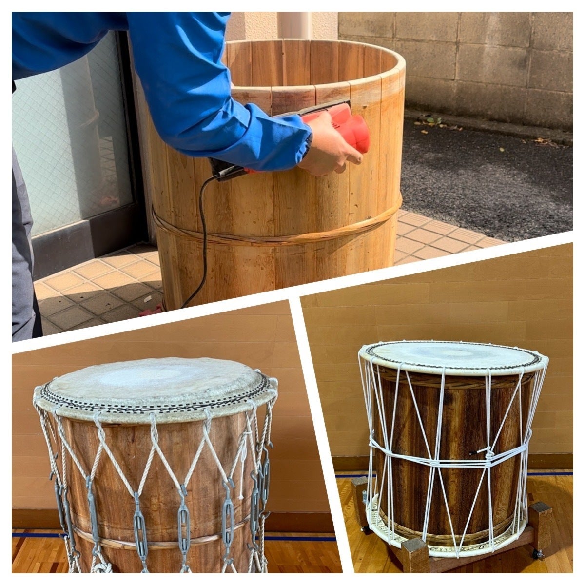 子どもたちも増え、「さぁこれから!」と行きたいところですが、6年生で卒団する「まがたま太鼓」では、保護者も数年間(子どもの在籍期間)の関りしかありません。毎年、保護者代表が代わり「よくわからない。」まま任期を終えるのです。そこで、次女も在籍していた私は、「数年かけて環境を整えたい。」と考え、小学校の備品であった太鼓を譲り受けました。これで、自分たちの判断で修繕が行えます。でも私たちに十分な費用(資金)は、ありません。そこで、SNSを利用し、教えていただきながら自分で修理を行いました。