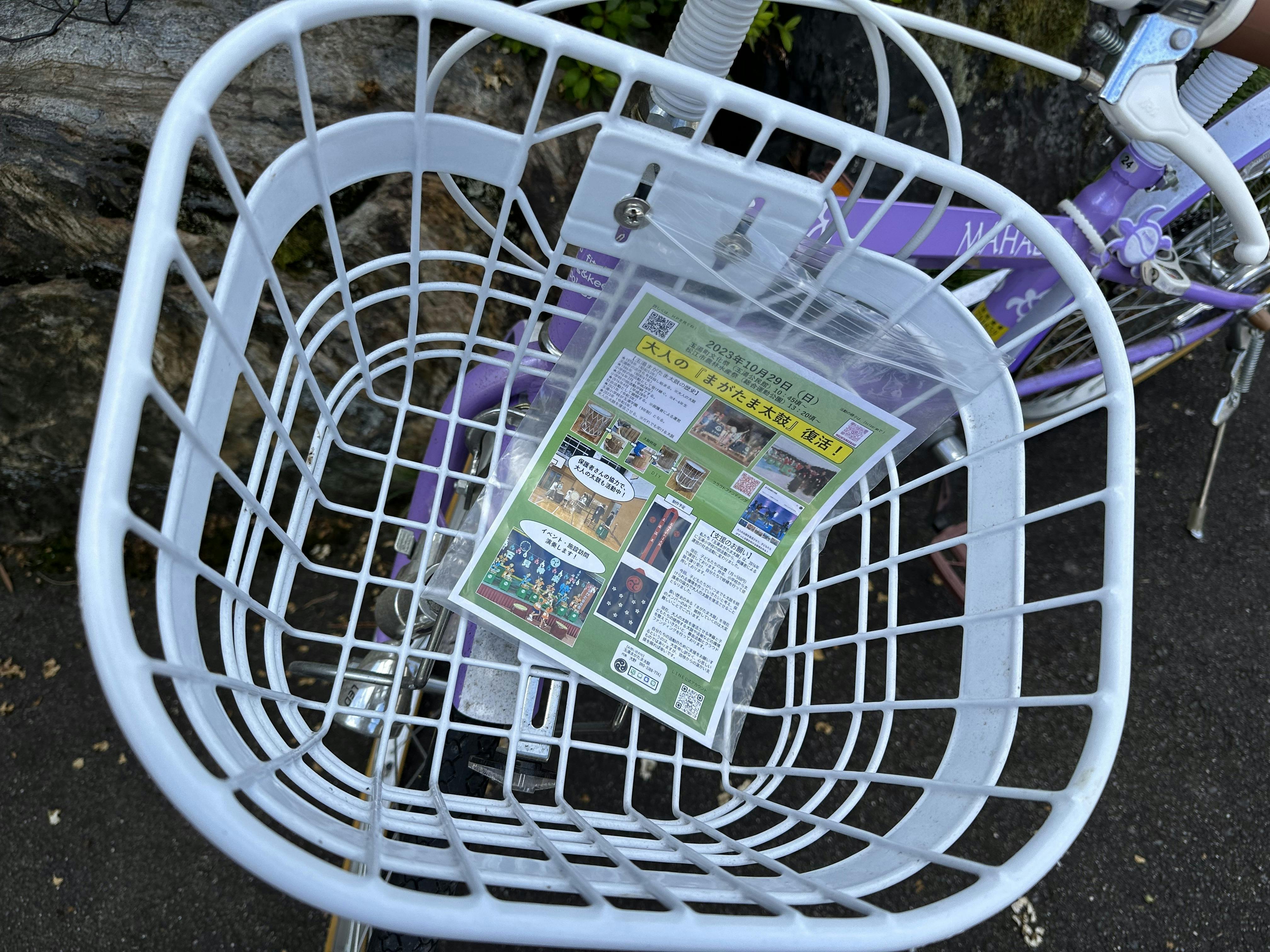 娘の自転車を借りて、午前中に会社やお店、温泉旅館、銀行、スーパーなどを飛び込み訪問して準備した60枚を配り切りました。
