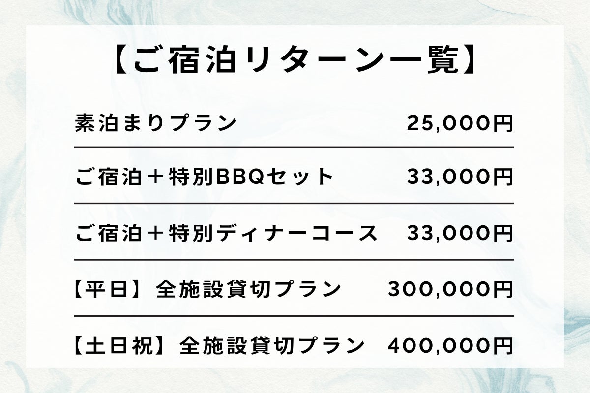 それに伴い、クラウドファンディング限定のお食事プランや初の試みである施設丸ごと貸切など、多くのリターン品をご用意いたしました。